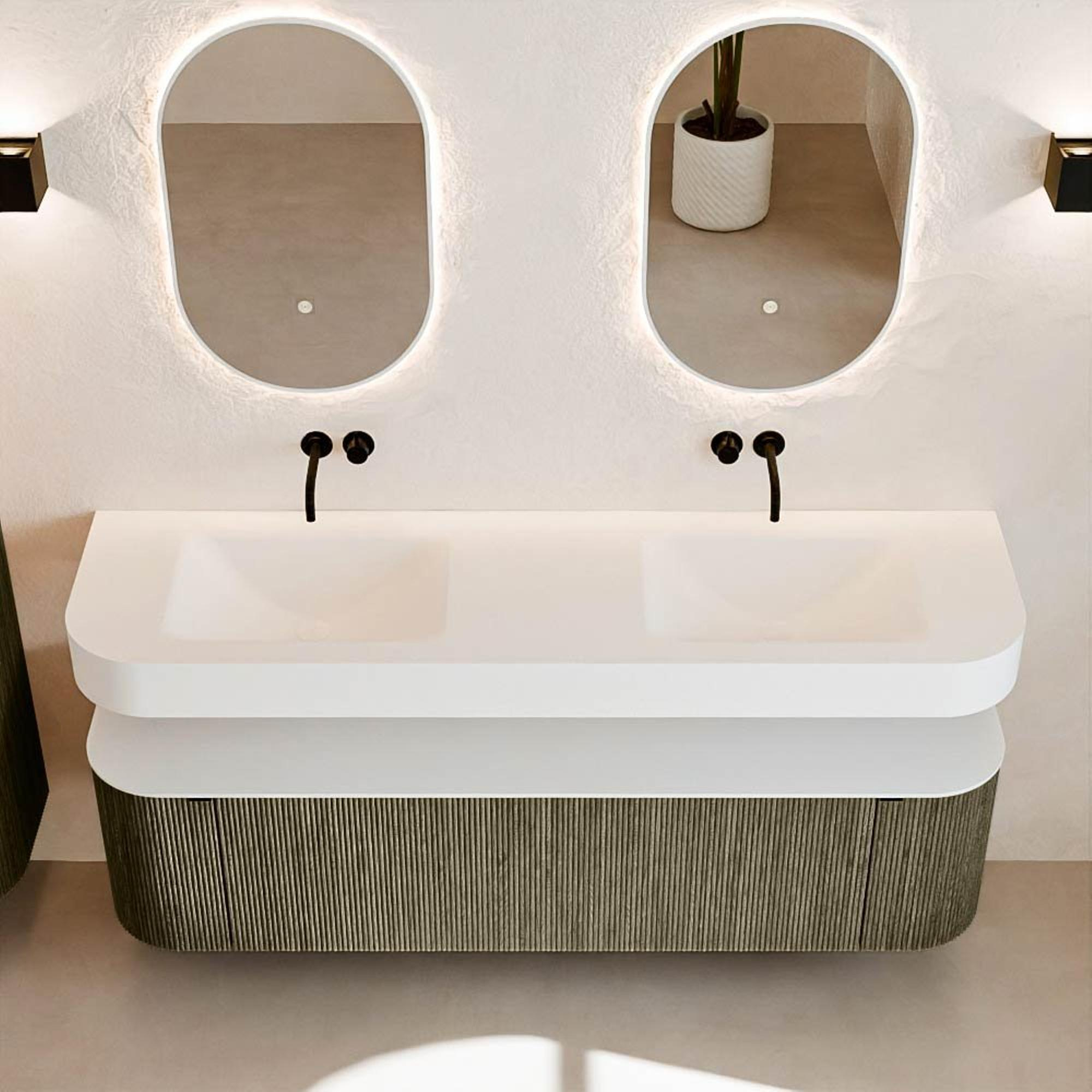Au-dessus du meuble flotte une vasque suspendue assortie aux coins arrondis – parfaitement adaptée à la forme du meuble. La vasque est réalisée en Solid Surface et suit subtilement les lignes du meuble inférieur, créant ainsi un ensemble harmonieux. Le plan de travail en Solid Surface forme une base solide, facile d'entretien, et complète la combinaison.