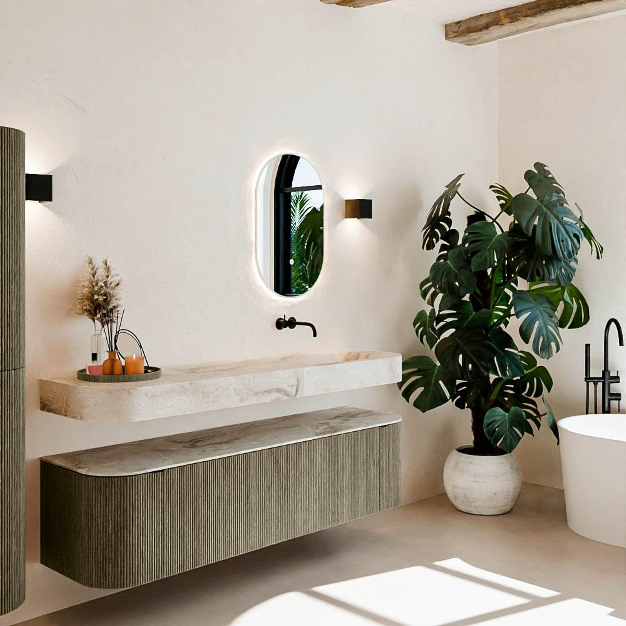 Matériaux naturels dans des tons chauds. Les nervures verticales apportent rythme et texture au design, tandis que le chêne confère une apparence chaleureuse et artisanale. Choisissez parmi 5 teintes de bois OAK, WALNUT, DUSK, SHADOW et RUBY, des couleurs de bois soigneusement sélectionnées pour enrichir les salles de bains modernes et classiques.