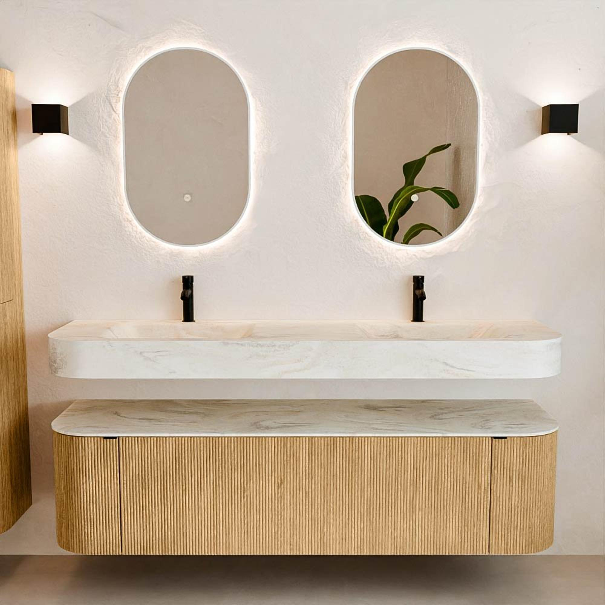 Matériaux naturels dans des tons chauds. Les nervures verticales apportent rythme et texture au design, tandis que le chêne confère une apparence chaleureuse et artisanale. Choisissez parmi 5 teintes de bois OAK, WALNUT, DUSK, SHADOW et RUBY, des couleurs de bois soigneusement sélectionnées pour enrichir les salles de bains modernes et classiques.