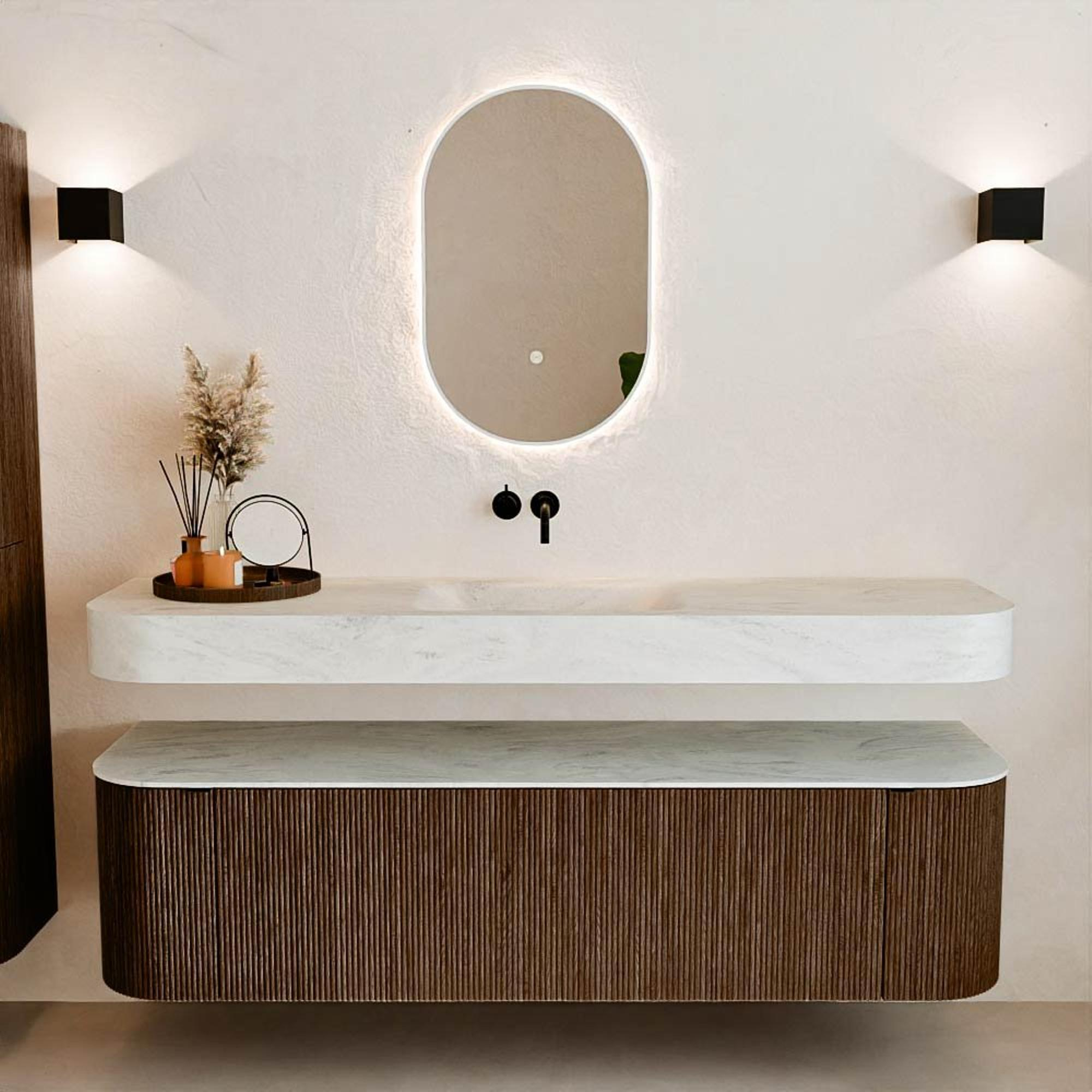 Au-dessus du meuble flotte une vasque suspendue assortie aux coins arrondis – parfaitement adaptée à la forme du meuble. La vasque est réalisée en Solid Surface et suit subtilement les lignes du meuble inférieur, créant un ensemble harmonieux. Le plan de travail en Solid Surface forme une base solide, facile d'entretien, et complète la combinaison.