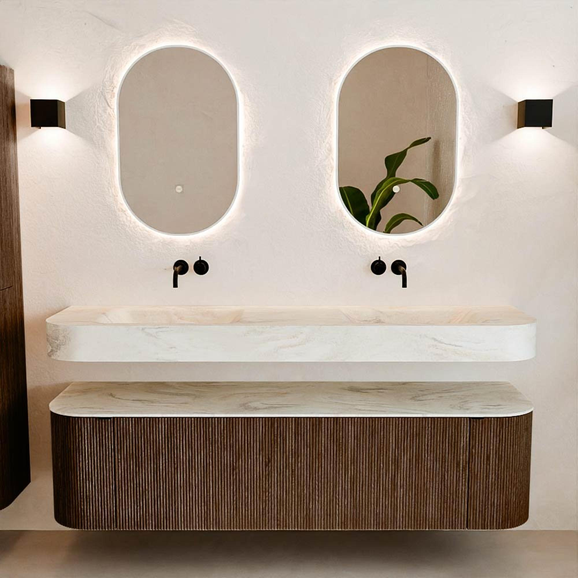 MONDIAZ THOR-DLUX 170cm meuble de salle de bains arrondi gauche + droite couleur Walnut avec 1 tiroir et 2 portes. Vasque suspendue CLOUD Double sans trou de robinet couleur Ostra.