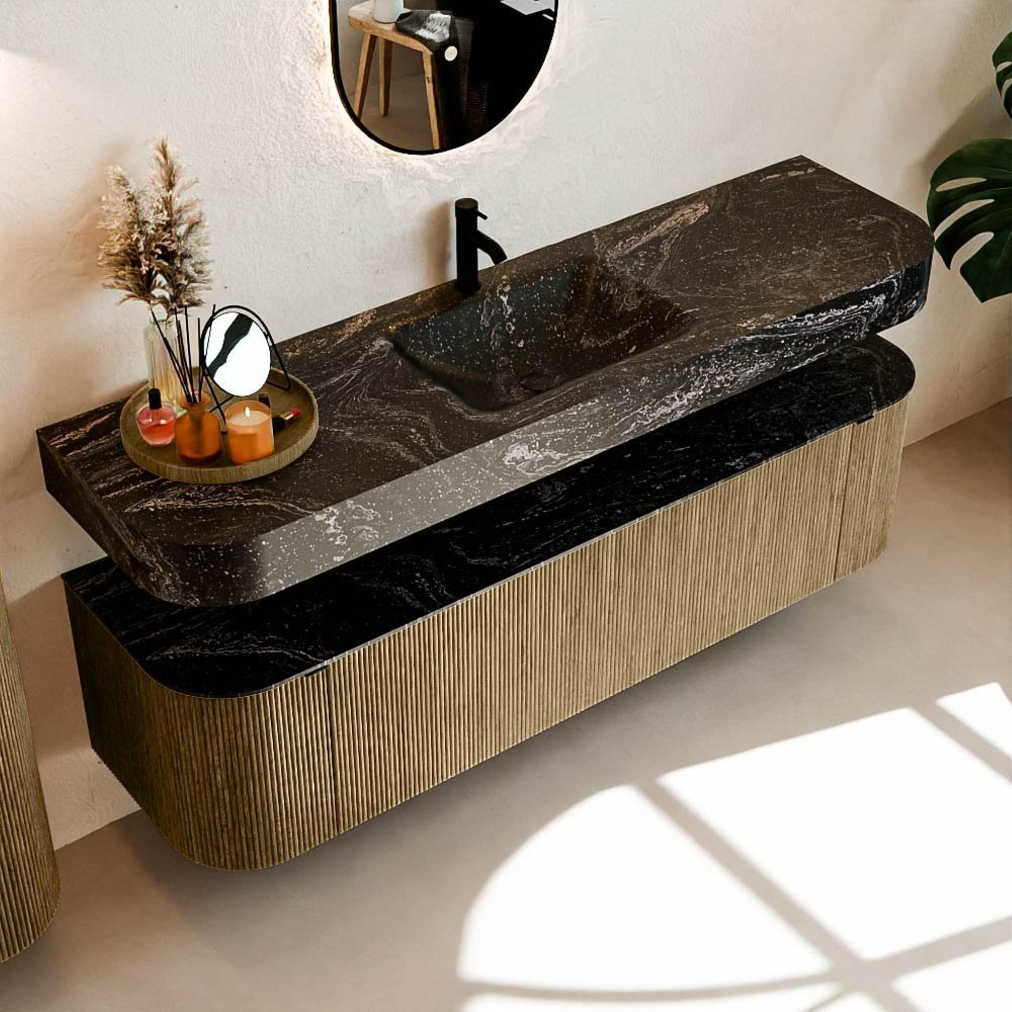 Matériaux naturels dans des tons chauds. Les nervures verticales apportent rythme et texture au design, tandis que le chêne confère une apparence chaleureuse et artisanale. Choisissez parmi 5 teintes de bois OAK, WALNUT, DUSK, SHADOW et RUBY, des couleurs de bois soigneusement sélectionnées pour enrichir les salles de bains modernes et classiques.