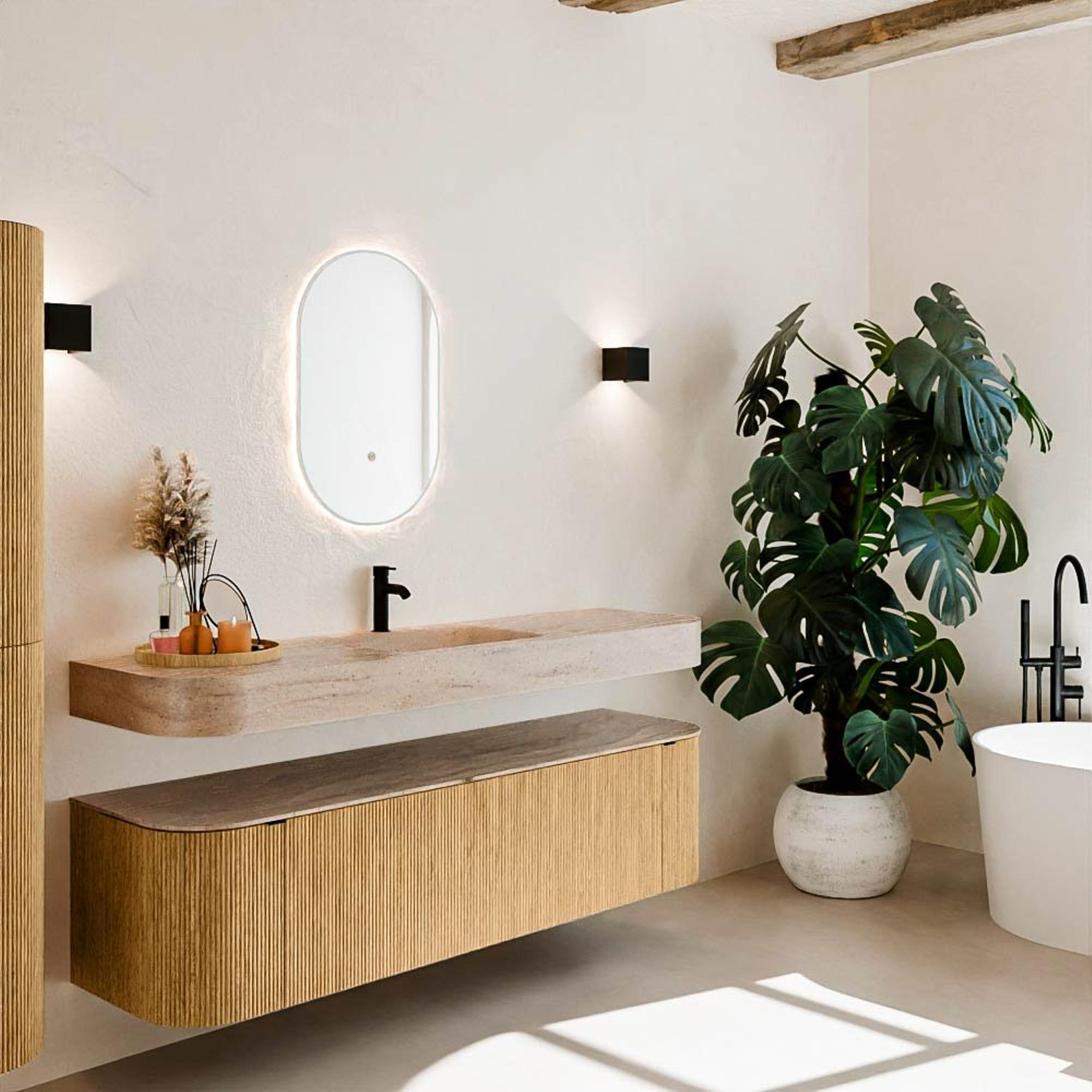 Matériaux naturels dans des tons chauds. Les nervures verticales apportent rythme et texture au design, tandis que le chêne confère une apparence chaleureuse et artisanale. Choisissez parmi 5 teintes de bois CHÊNE, NOYER, DUSK, SHADOW et RUBY, des couleurs de bois soigneusement sélectionnées pour enrichir les salles de bains modernes et classiques.