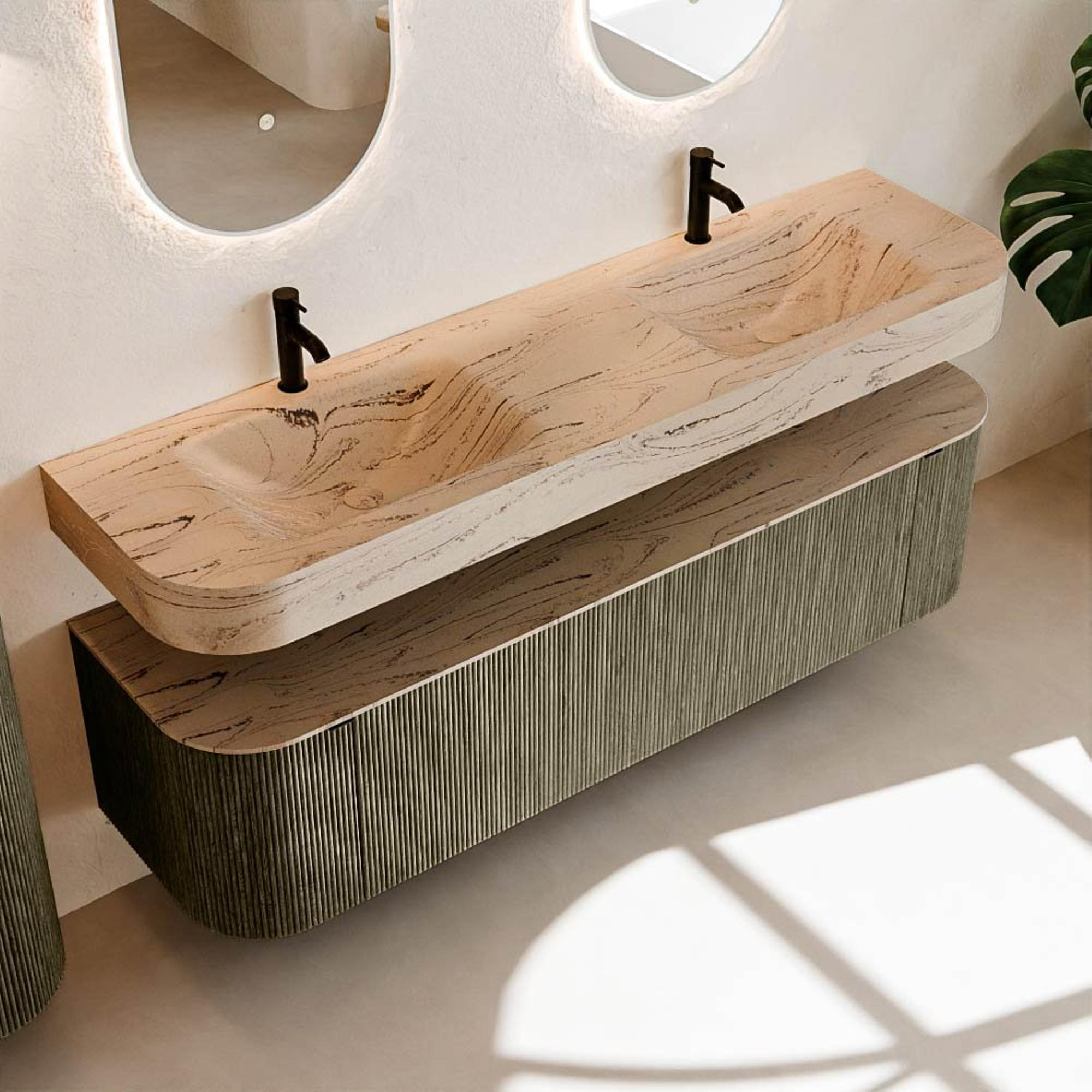 Matériaux naturels aux tons chauds. Les cannelures verticales apportent rythme et texture au design, tandis que le chêne confère une apparence chaleureuse et artisanale. Choisissez parmi 5 teintes de bois OAK, WALNUT, DUSK, SHADOW et RUBY, des couleurs de bois soigneusement sélectionnées pour enrichir les salles de bains modernes et classiques.