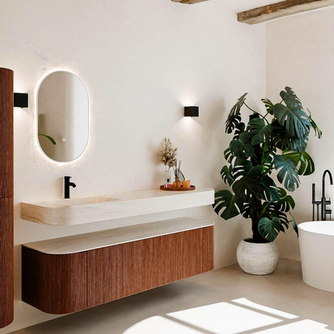 Matériaux naturels dans des tons chauds. Les cannelures verticales apportent rythme et texture au design, tandis que le chêne confère une apparence chaleureuse et artisanale. Choisissez parmi 5 teintes de bois OAK, WALNUT, DUSK, SHADOW et RUBY, des couleurs de bois soigneusement sélectionnées pour enrichir les salles de bains modernes et classiques.