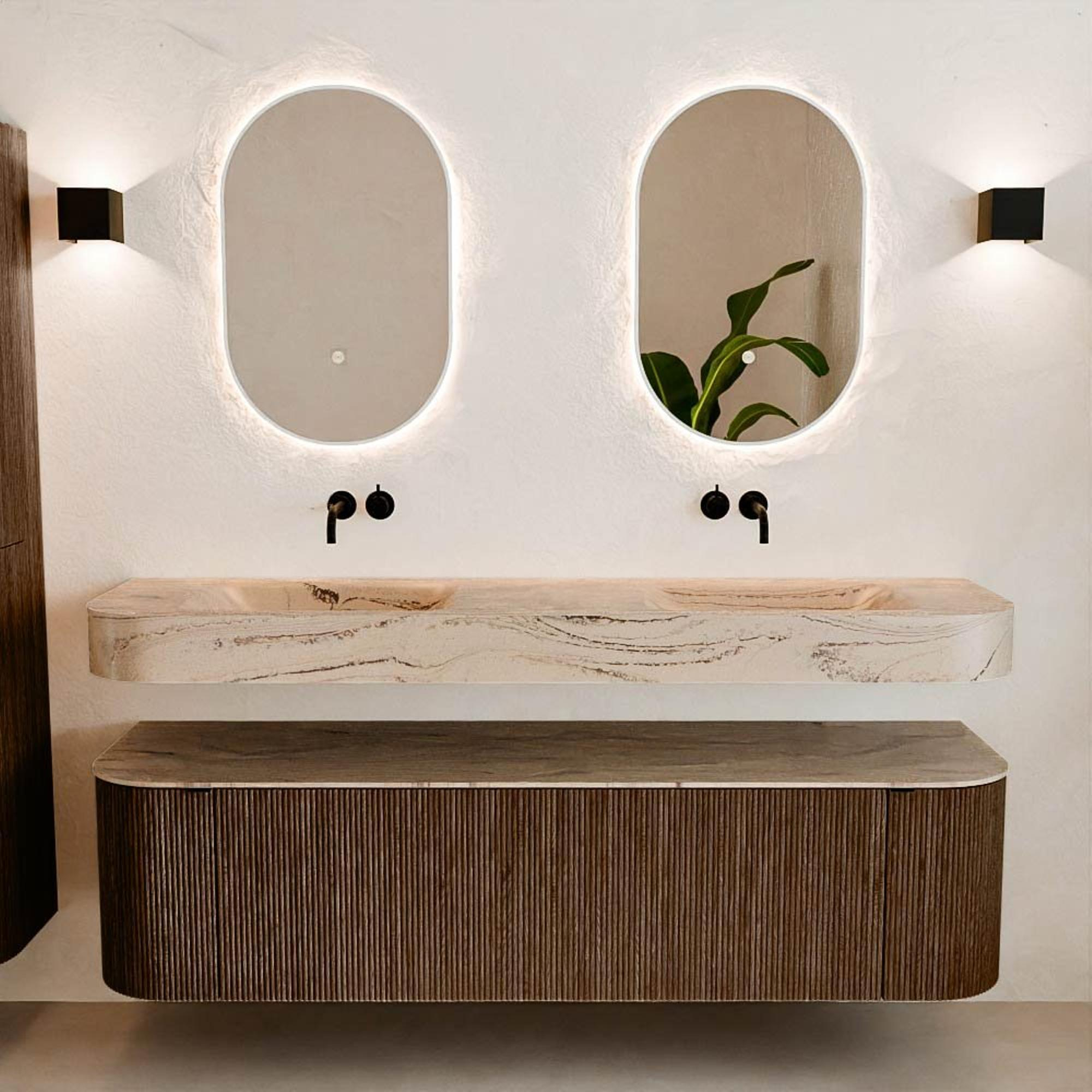 Matériaux naturels dans des tons chauds. Les nervures verticales apportent rythme et texture au design, tandis que le chêne confère une apparence chaleureuse et artisanale. Choisissez parmi 5 teintes de bois OAK, WALNUT, DUSK, SHADOW et RUBY, des couleurs de bois soigneusement sélectionnées pour enrichir les salles de bains modernes et classiques.