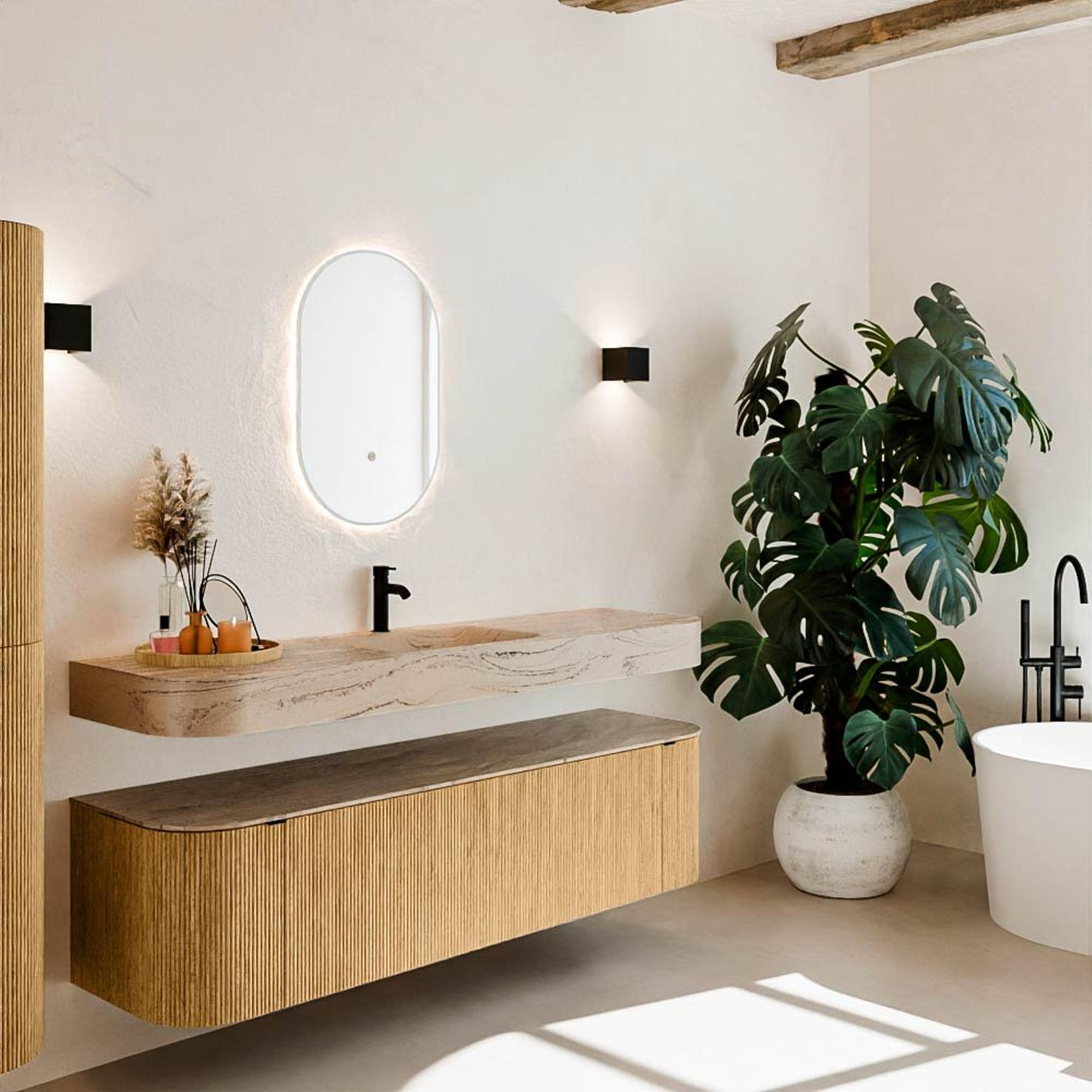Matériaux naturels dans des tons chauds. Les rainures verticales apportent rythme et texture au design, tandis que le chêne confère une apparence chaleureuse et artisanale. Choisissez parmi 5 teintes de bois OAK, WALNUT, DUSK, SHADOW et RUBY, des couleurs de bois soigneusement sélectionnées pour enrichir les salles de bains modernes et classiques.