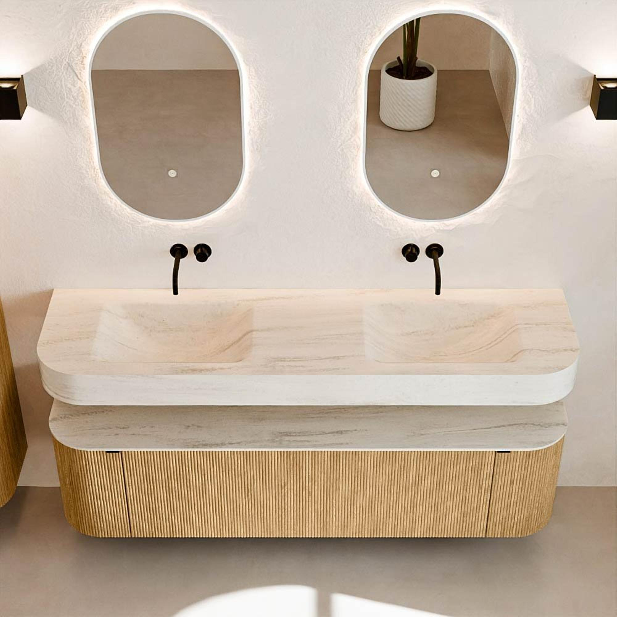 MONDIAZ THOR-DLUX Meuble de salle de bains 170cm arrondi gauche + droite couleur Oak avec 1 tiroir et 2 portes. Vasque suspendue CLOUD Double sans trou de robinet couleur Meli.