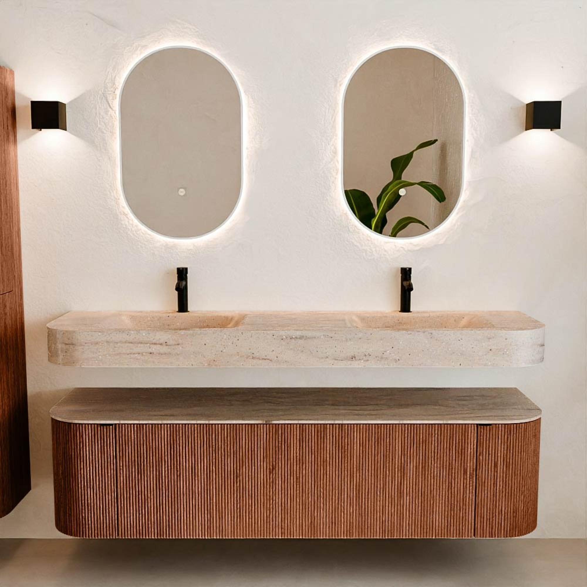 Matériaux naturels dans des tons chauds. Les nervures verticales apportent rythme et texture au design, tandis que le chêne confère une apparence chaleureuse et artisanale. Choisissez parmi 5 teintes de bois OAK, WALNUT, DUSK, SHADOW et RUBY, des couleurs de bois soigneusement sélectionnées pour enrichir les salles de bains modernes et classiques.