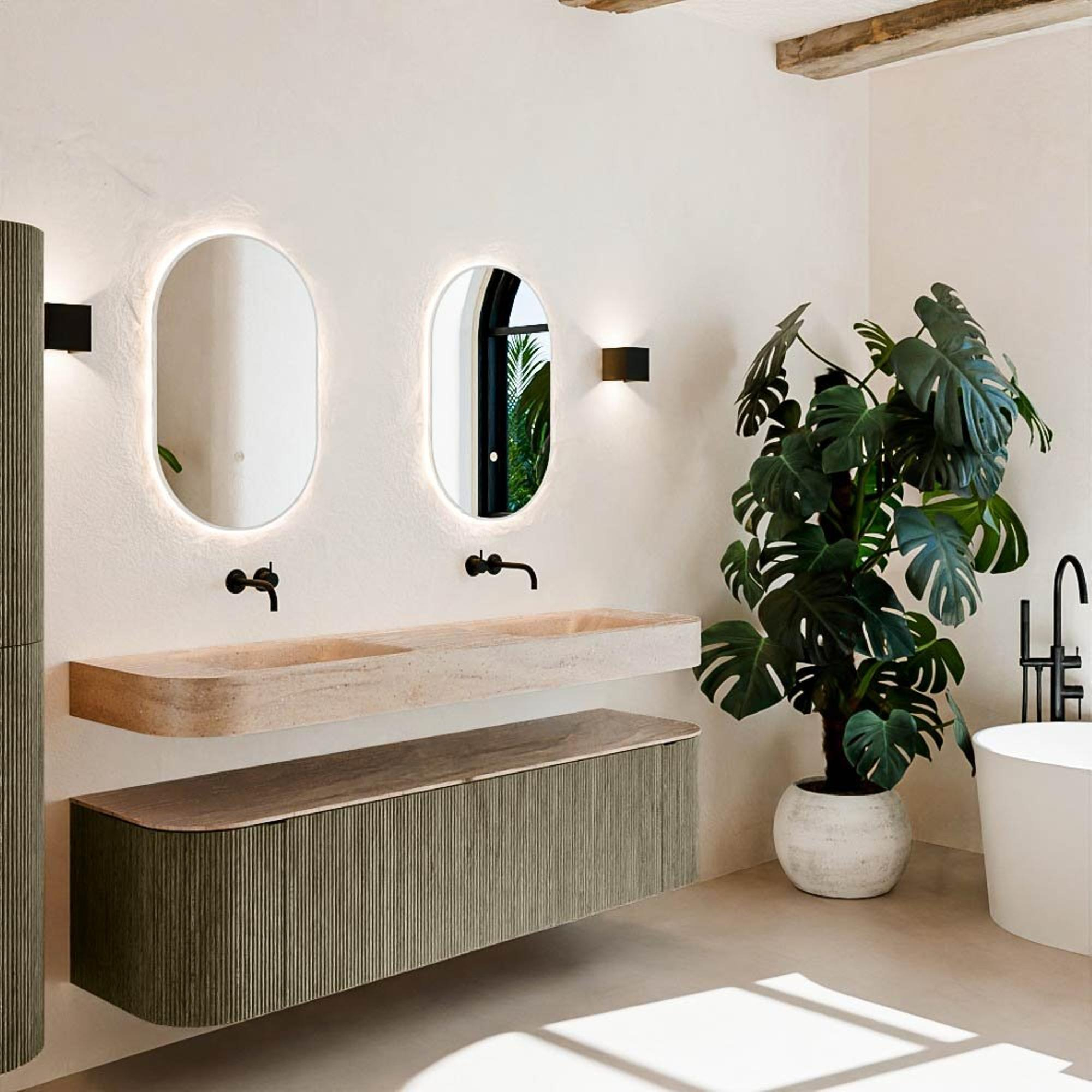 Matériaux naturels dans des tons chauds. Les rainures verticales apportent rythme et texture au design, tandis que le chêne confère une apparence chaleureuse et artisanale. Choisissez parmi 5 teintes de bois OAK, WALNUT, DUSK, SHADOW et RUBY, des couleurs de bois soigneusement sélectionnées pour enrichir les salles de bains modernes et classiques.