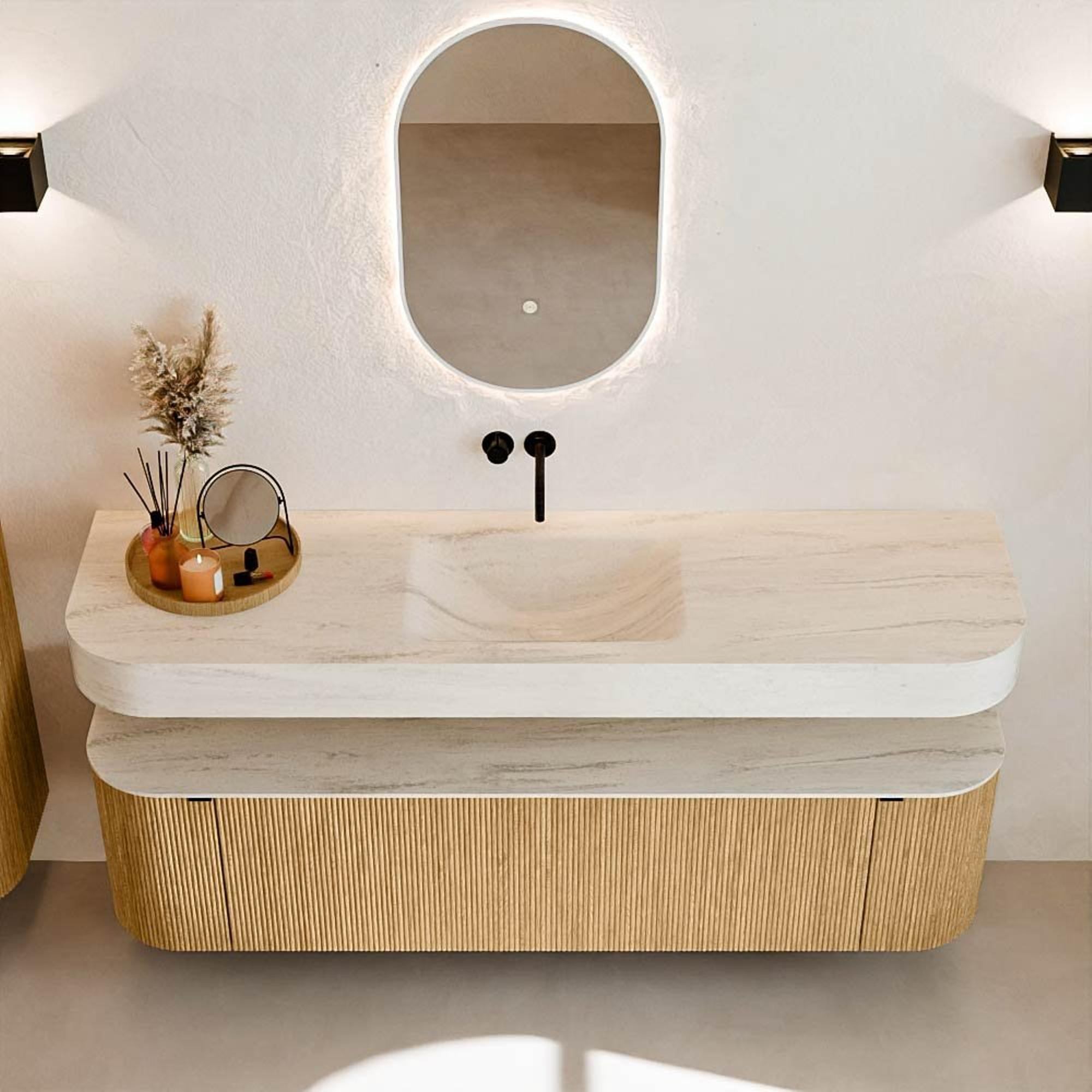 Au-dessus du meuble flotte une vasque suspendue assortie aux coins arrondis – parfaitement adaptée à la forme du meuble. La vasque est réalisée en Solid Surface et suit subtilement les lignes du meuble inférieur, créant un ensemble harmonieux. Le plan de travail en Solid Surface constitue une base solide et facile d'entretien, complétant la combinaison.