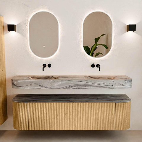 Matériaux naturels dans des tons chauds. Les nervures verticales apportent rythme et texture au design, tandis que le chêne confère une apparence chaleureuse et artisanale. Choisissez parmi 5 teintes de bois OAK, WALNUT, DUSK, SHADOW et RUBY, des couleurs de bois soigneusement sélectionnées pour enrichir les salles de bains modernes et classiques.