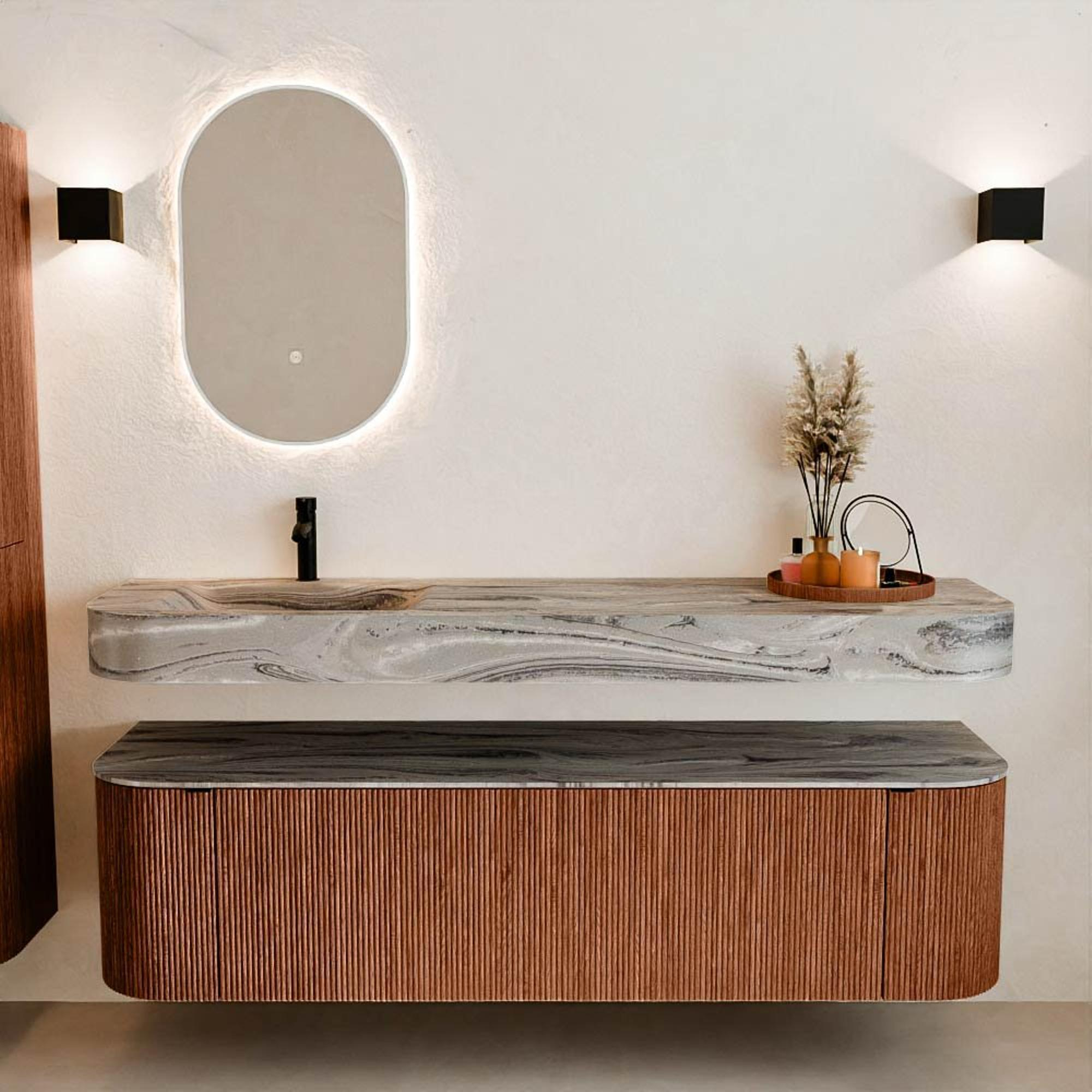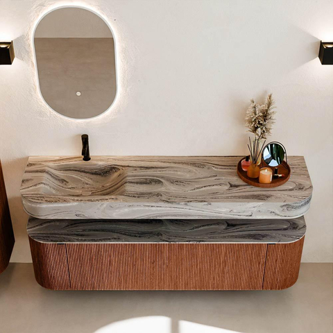 Au-dessus du meuble flotte une vasque suspendue assortie aux coins arrondis – parfaitement adaptée à la forme du meuble. La vasque est réalisée en Solid Surface et suit subtilement les lignes du meuble inférieur, créant ainsi un ensemble harmonieux. Le plan de travail en Solid Surface constitue une base solide et facile d'entretien, complétant la combinaison.