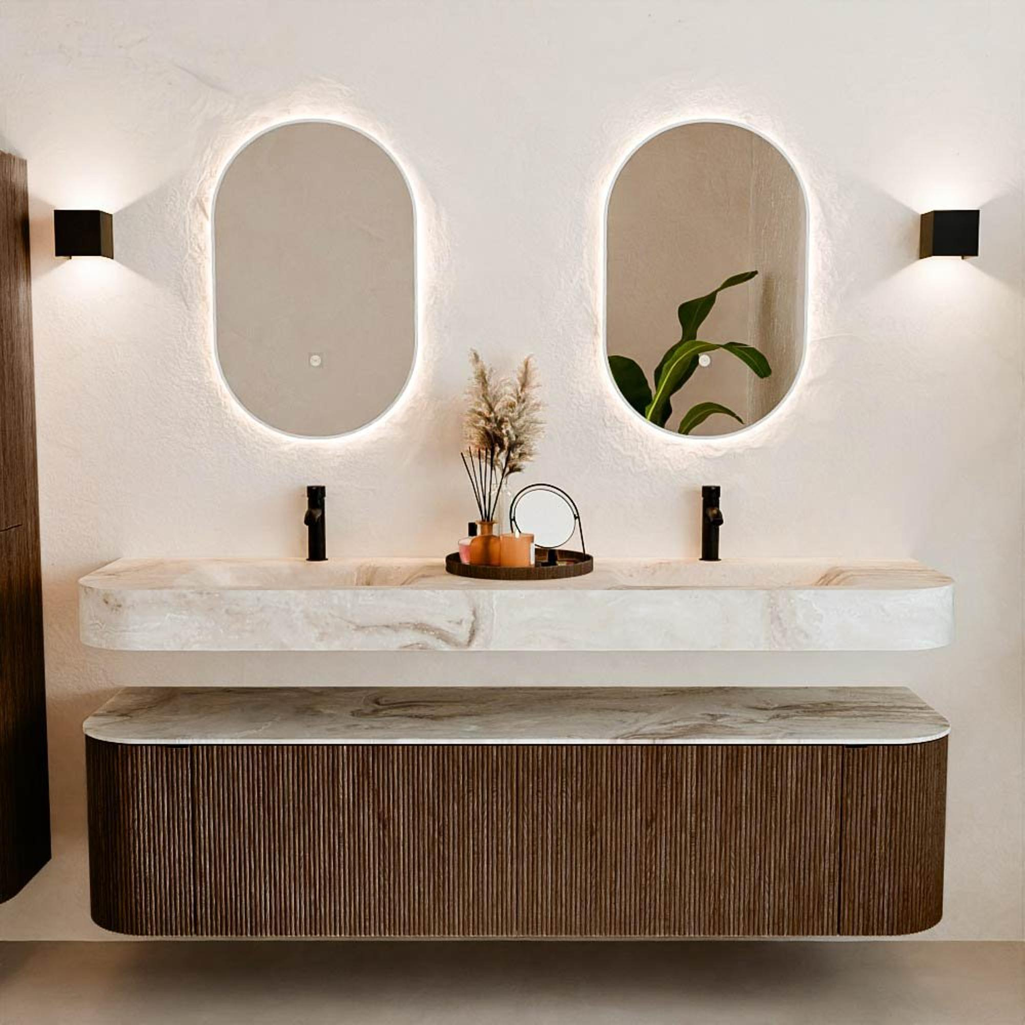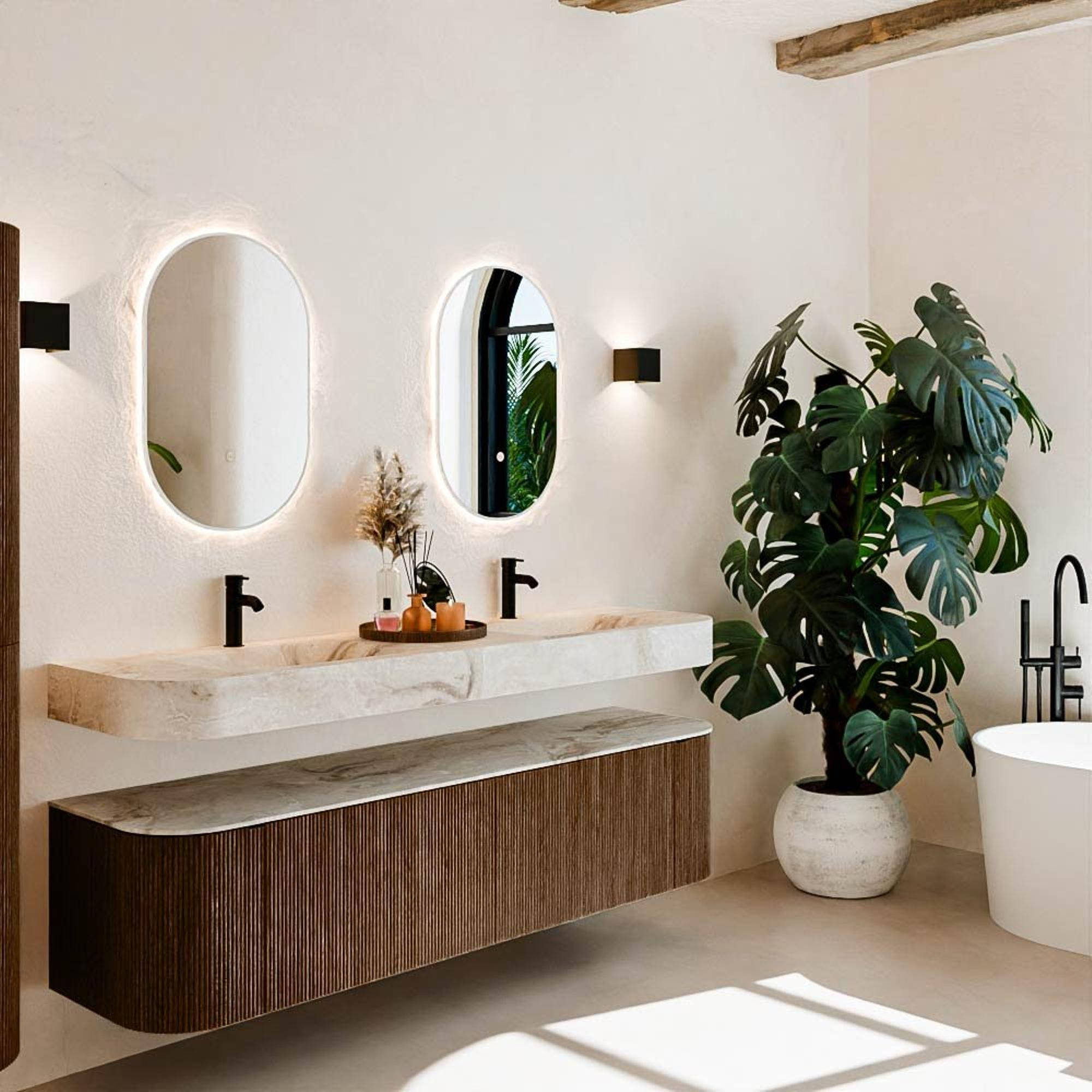 Matériaux naturels dans des tons chauds. Les rainures verticales apportent rythme et texture au design, tandis que le chêne confère une apparence chaleureuse et artisanale. Choisissez parmi 5 teintes de bois OAK, WALNUT, DUSK, SHADOW et RUBY, des couleurs de bois soigneusement sélectionnées pour enrichir les salles de bains modernes et classiques.