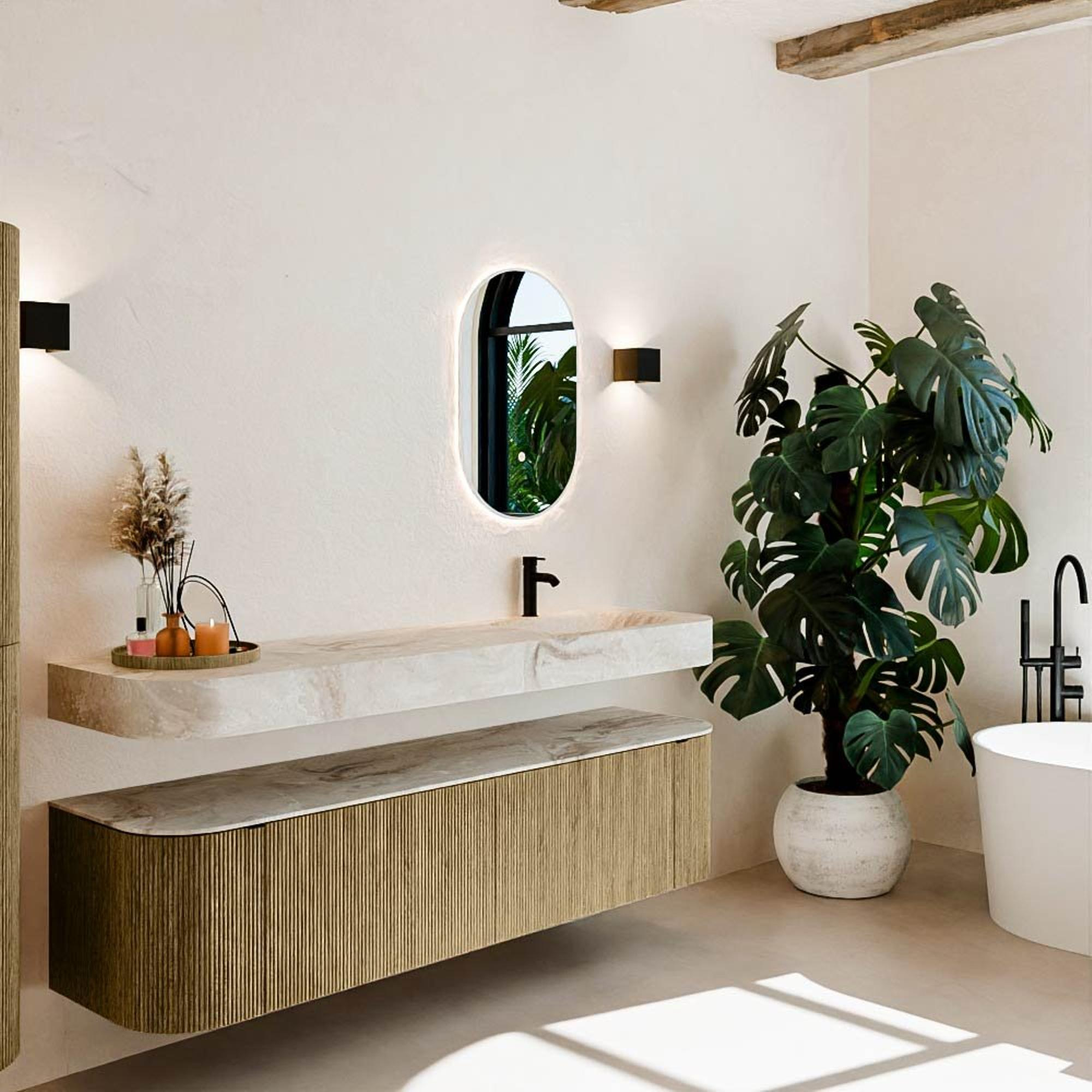 Matériaux naturels dans des tons chauds. Les rainures verticales apportent rythme et texture au design, tandis que le chêne confère une apparence chaleureuse et artisanale. Choisissez parmi 5 teintes de bois OAK, WALNUT, DUSK, SHADOW et RUBY, des couleurs de bois soigneusement sélectionnées pour enrichir les salles de bains modernes et classiques.