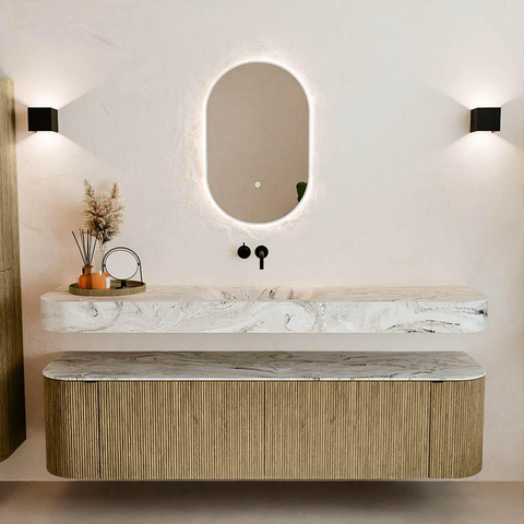 Au-dessus du meuble flotte une vasque suspendue assortie aux coins arrondis – parfaitement adaptée à la forme du meuble. La vasque est réalisée en Solid Surface et suit subtilement les lignes du meuble inférieur, créant ainsi un ensemble harmonieux. Le plan de travail en Solid Surface constitue une base solide et facile d’entretien, complétant la combinaison.
