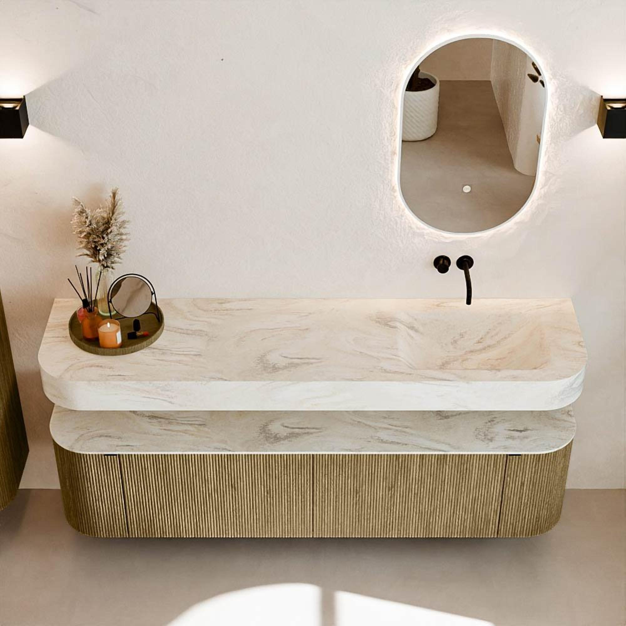 Au-dessus du meuble flotte une vasque suspendue assortie avec des coins arrondis – parfaitement adaptée à la forme du meuble. La vasque est réalisée en Solid Surface et suit subtilement les lignes du meuble inférieur, créant ainsi un ensemble harmonieux. Le plan de travail en Solid Surface forme une base solide et facile d'entretien et complète la combinaison.