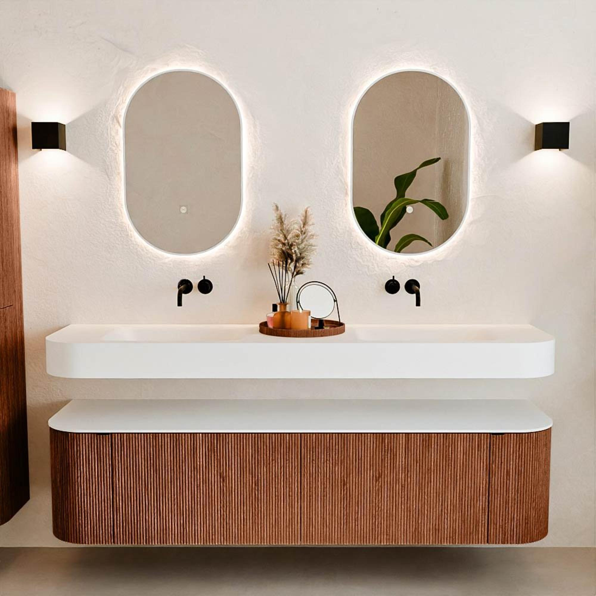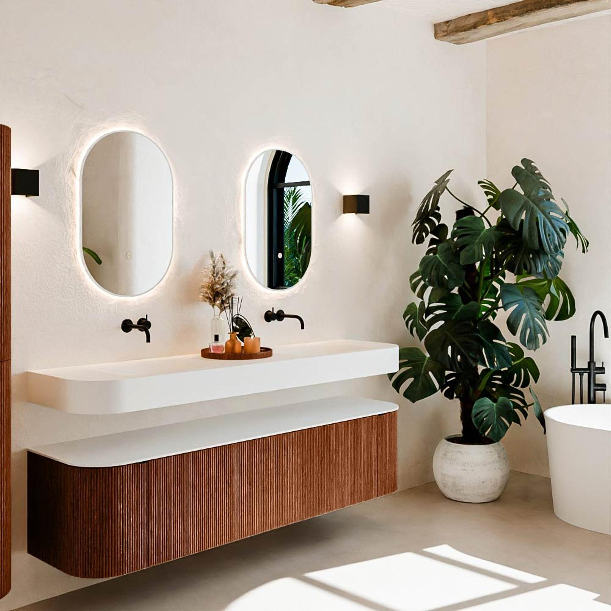 Matériaux naturels aux teintes chaudes. Les nervures verticales apportent rythme et texture au design, tandis que le chêne confère une apparence chaleureuse et artisanale. Choisissez parmi 5 teintes de bois OAK, WALNUT, DUSK, SHADOW et RUBY, des couleurs de bois soigneusement sélectionnées pour enrichir les salles de bains modernes et classiques.