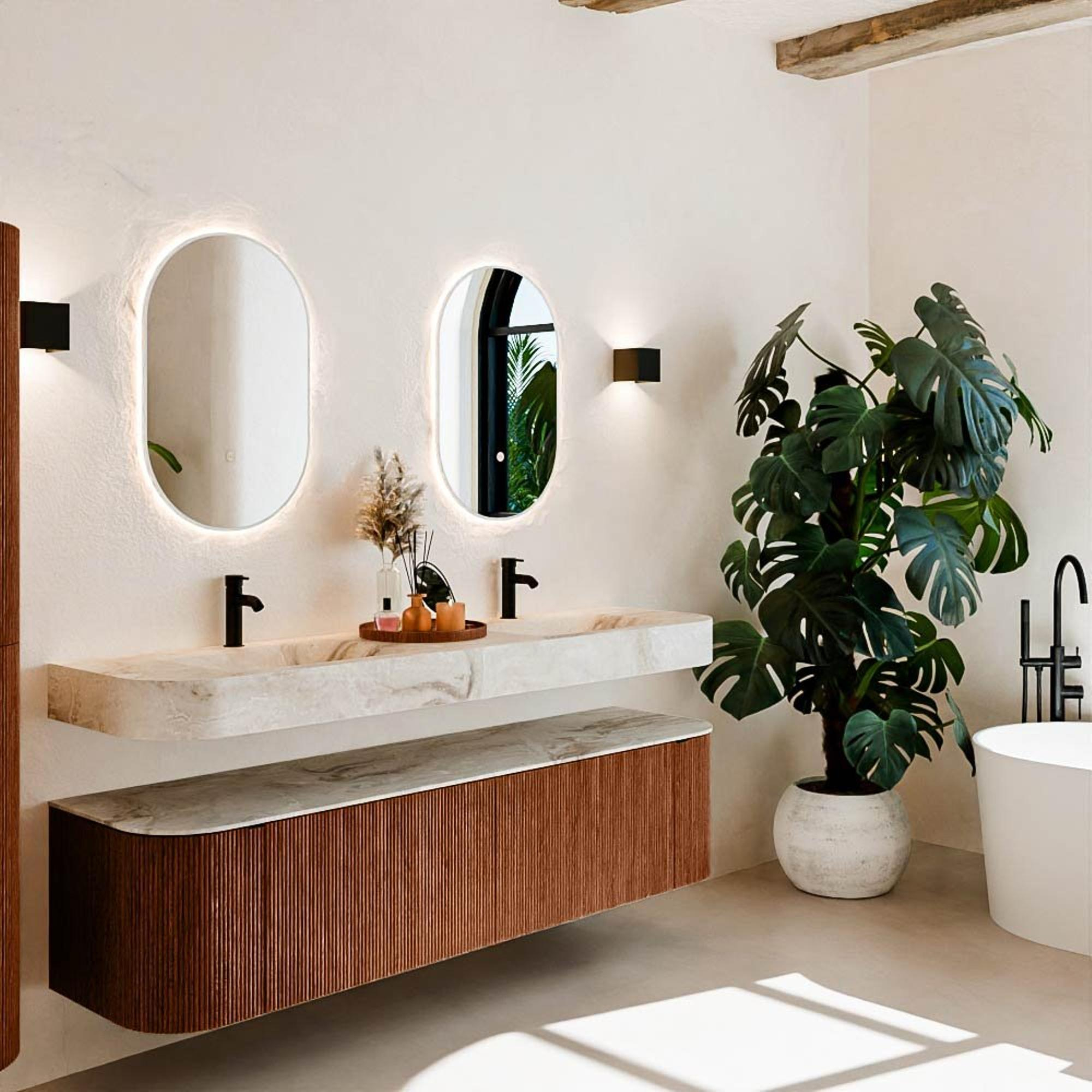 Matériaux naturels dans des tons chauds. Les nervures verticales apportent rythme et texture au design, tandis que le chêne confère une apparence chaleureuse et artisanale. Choisissez parmi 5 teintes de bois OAK, WALNUT, DUSK, SHADOW et RUBY, des couleurs de bois soigneusement sélectionnées pour enrichir les salles de bains modernes et classiques.