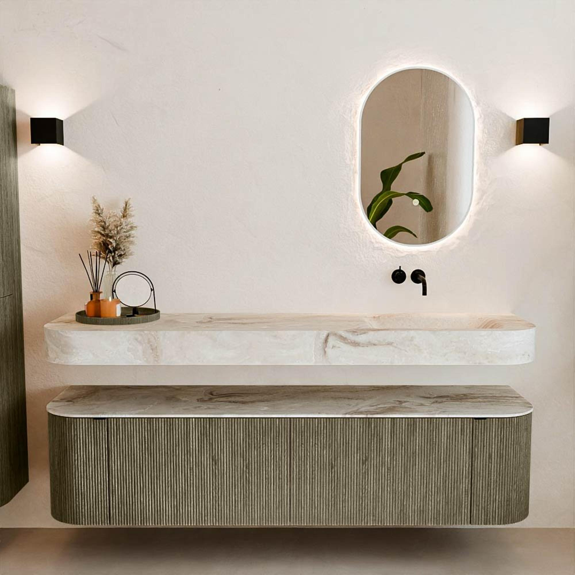 Matériaux naturels dans des tons chauds. Les nervures verticales apportent rythme et texture au design, tandis que le chêne confère une apparence chaleureuse et artisanale. Choisissez parmi 5 teintes de bois OAK, WALNUT, DUSK, SHADOW et RUBY, des couleurs de bois soigneusement sélectionnées pour enrichir les salles de bains modernes et classiques.