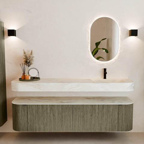 Matériaux naturels dans des tons chauds. Les nervures verticales apportent rythme et texture au design, tandis que le chêne confère une apparence chaleureuse et artisanale. Choisissez parmi 5 teintes de bois OAK, WALNUT, DUSK, SHADOW et RUBY, des couleurs de bois soigneusement sélectionnées pour enrichir les salles de bains modernes et classiques.