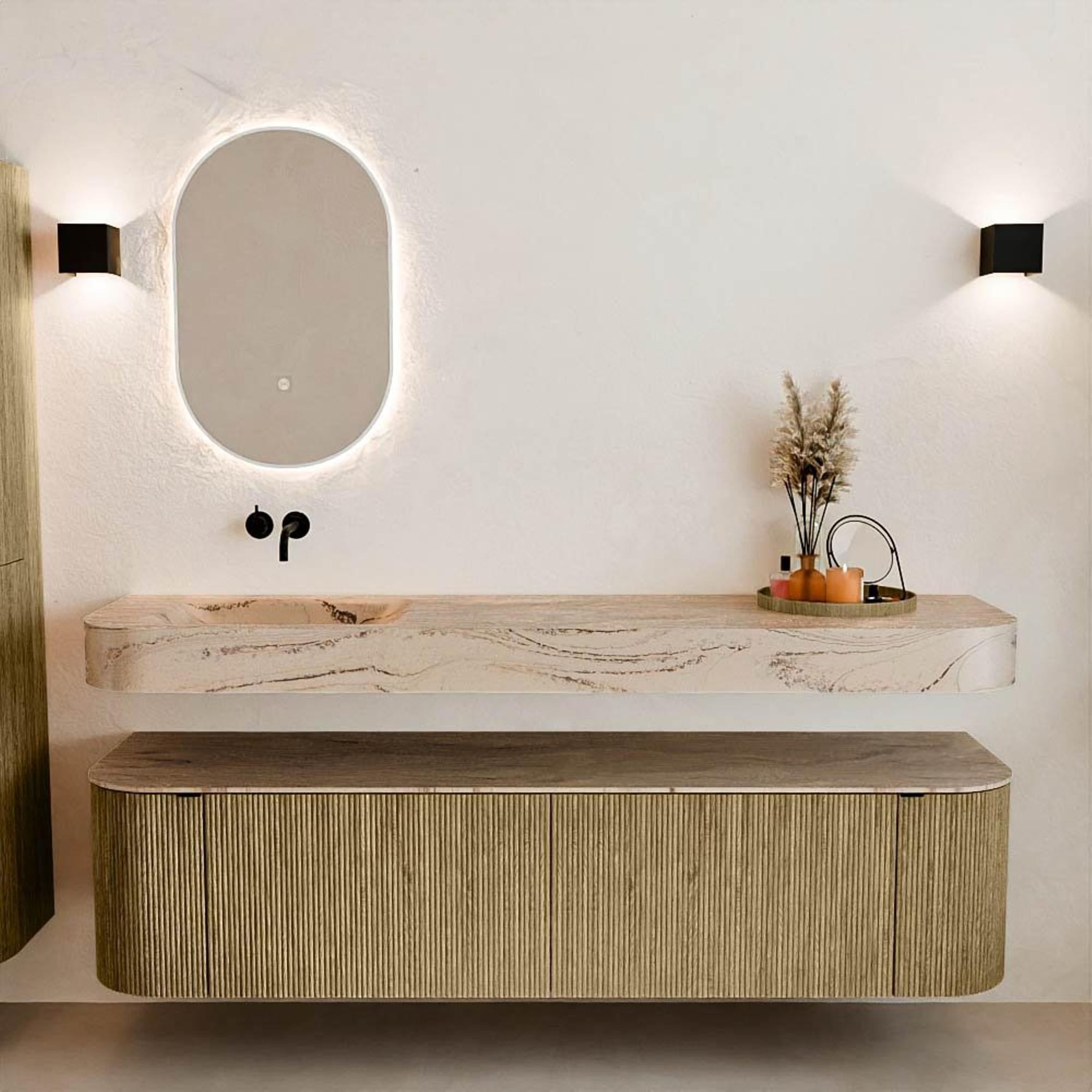 Matériaux naturels dans des tons chauds. Les reliefs verticaux apportent rythme et texture au design, tandis que le chêne confère une apparence chaleureuse et artisanale. Choisissez parmi 5 teintes de bois OAK, WALNUT, DUSK, SHADOW et RUBY, des couleurs de bois soigneusement sélectionnées pour enrichir les salles de bains modernes et classiques.