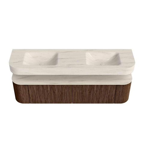 MONDIAZ THOR-DLUX 180cm meuble de salle de bains arrondi gauche + droite couleur Walnut avec 2 tiroirs et 2 portes. Vasque suspendue CLOUD Double sans trou de robinet couleur Meli.