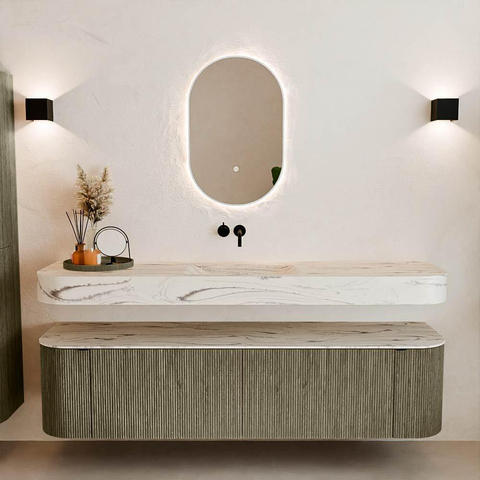 Matériaux naturels dans des tons chauds. Les nervures verticales apportent rythme et texture au design, tandis que le chêne confère une apparence chaleureuse et artisanale. Choisissez parmi 5 teintes de bois OAK, WALNUT, DUSK, SHADOW et RUBY, des couleurs de bois soigneusement sélectionnées pour enrichir les salles de bains modernes et classiques.