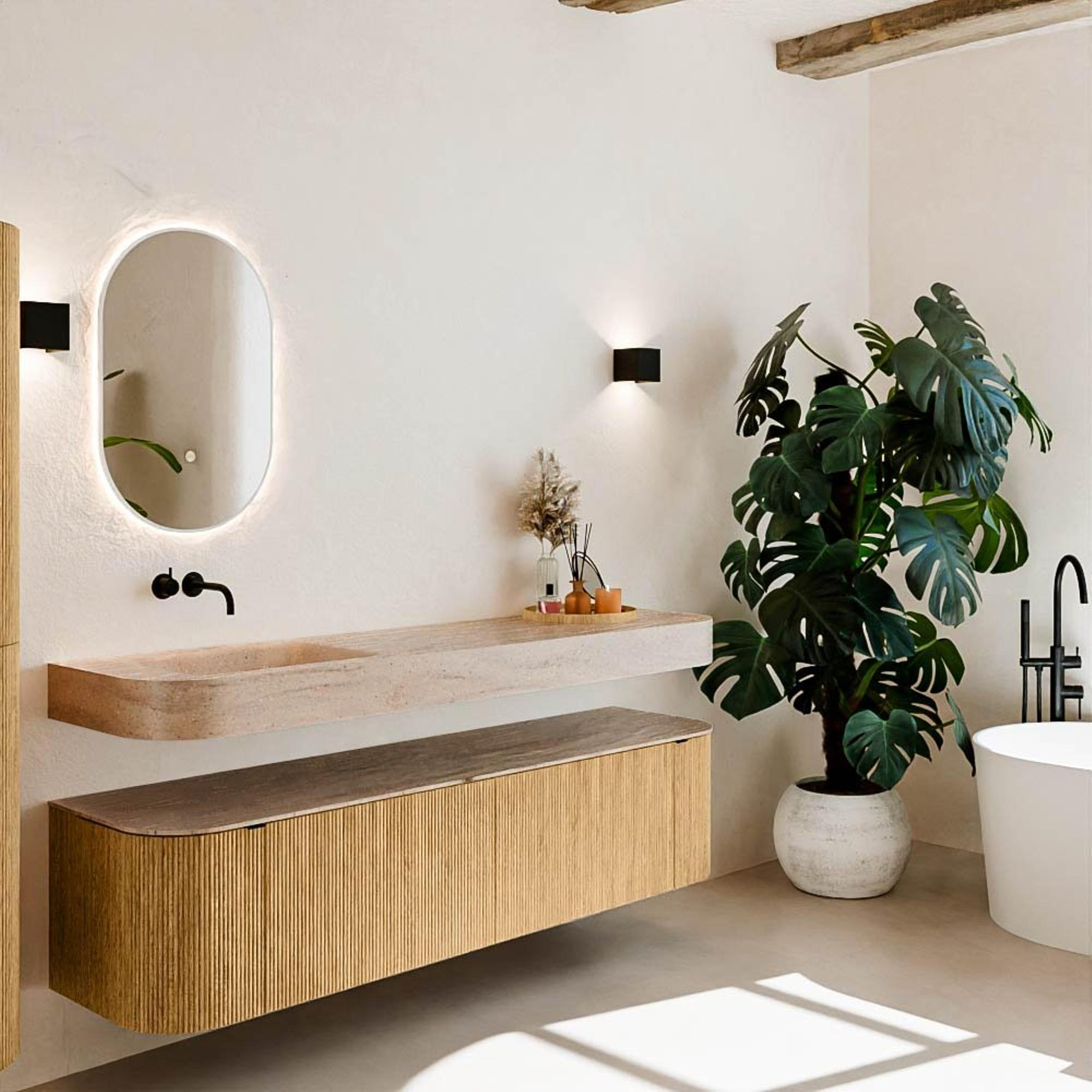Matériaux naturels dans des tons chauds. Les cannelures verticales apportent rythme et texture au design, tandis que le chêne confère une apparence chaleureuse et artisanale. Choisissez parmi 5 teintes de bois Chêne, Noyer, Dusk, Shadow et Ruby, des couleurs de bois soigneusement sélectionnées pour enrichir les salles de bains modernes et classiques.