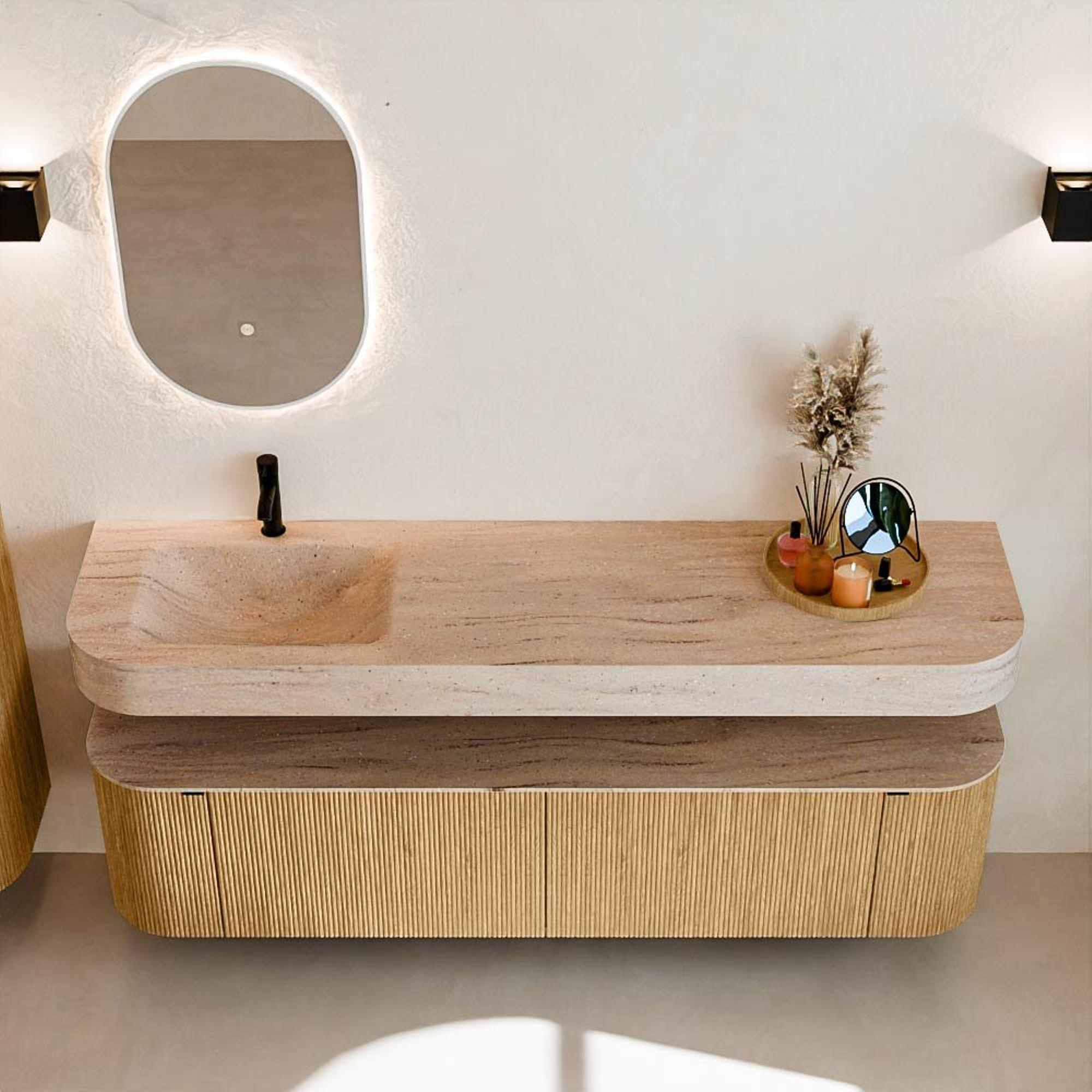 MONDIAZ THOR-DLUX 180cm meuble de salle de bains arrondi gauche + droite couleur Oak avec 2 tiroirs et 2 portes. Vasque suspendue CLOUD Gauche 1 trou de robinet couleur Saba.