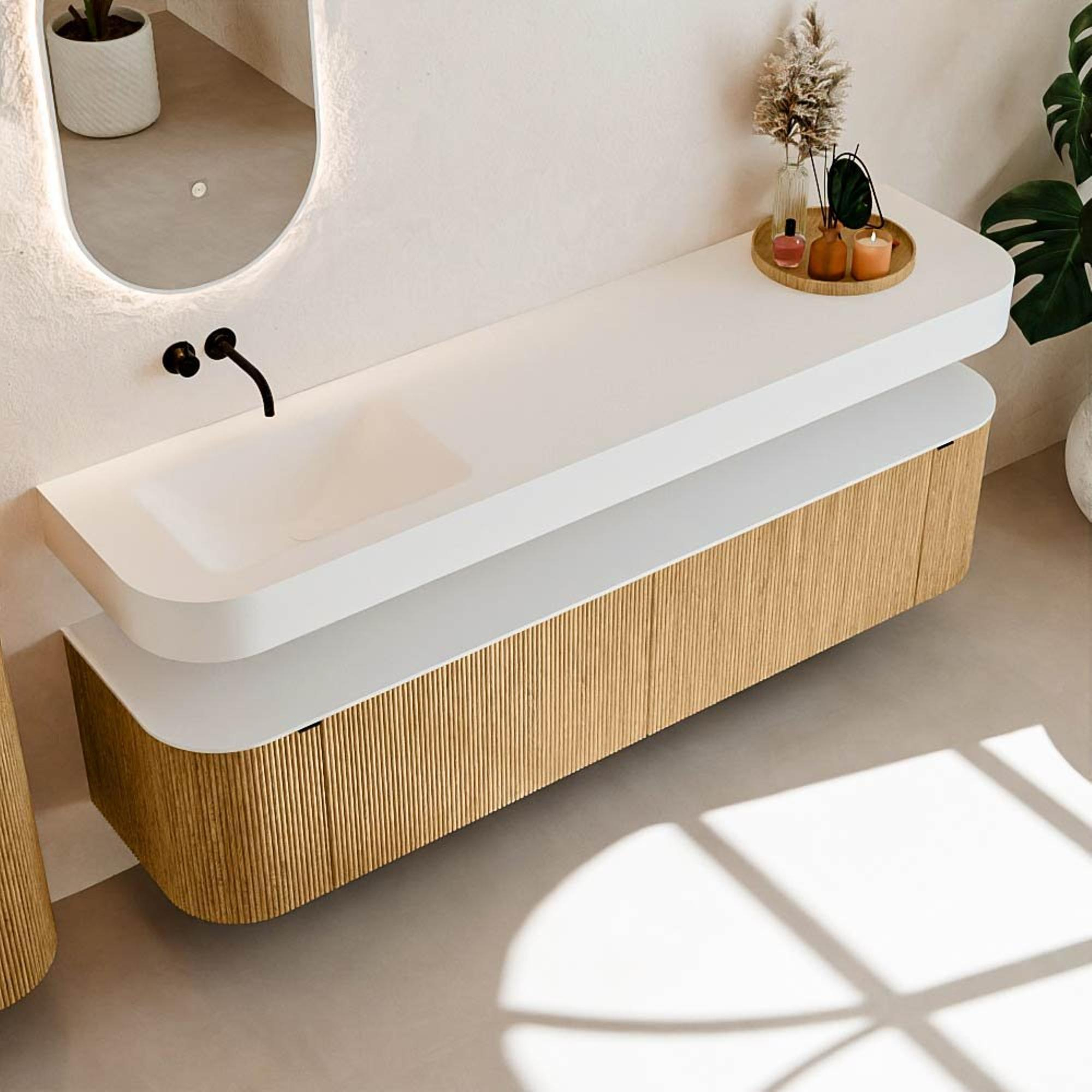 Au-dessus du meuble flotte une vasque suspendue assortie aux coins arrondis – parfaitement adaptée à la forme du meuble. La vasque est en Solid Surface et suit subtilement les lignes du meuble inférieur, créant ainsi un ensemble harmonieux. Le plan de travail en Solid Surface constitue une base solide et facile d'entretien, complétant la combinaison.
