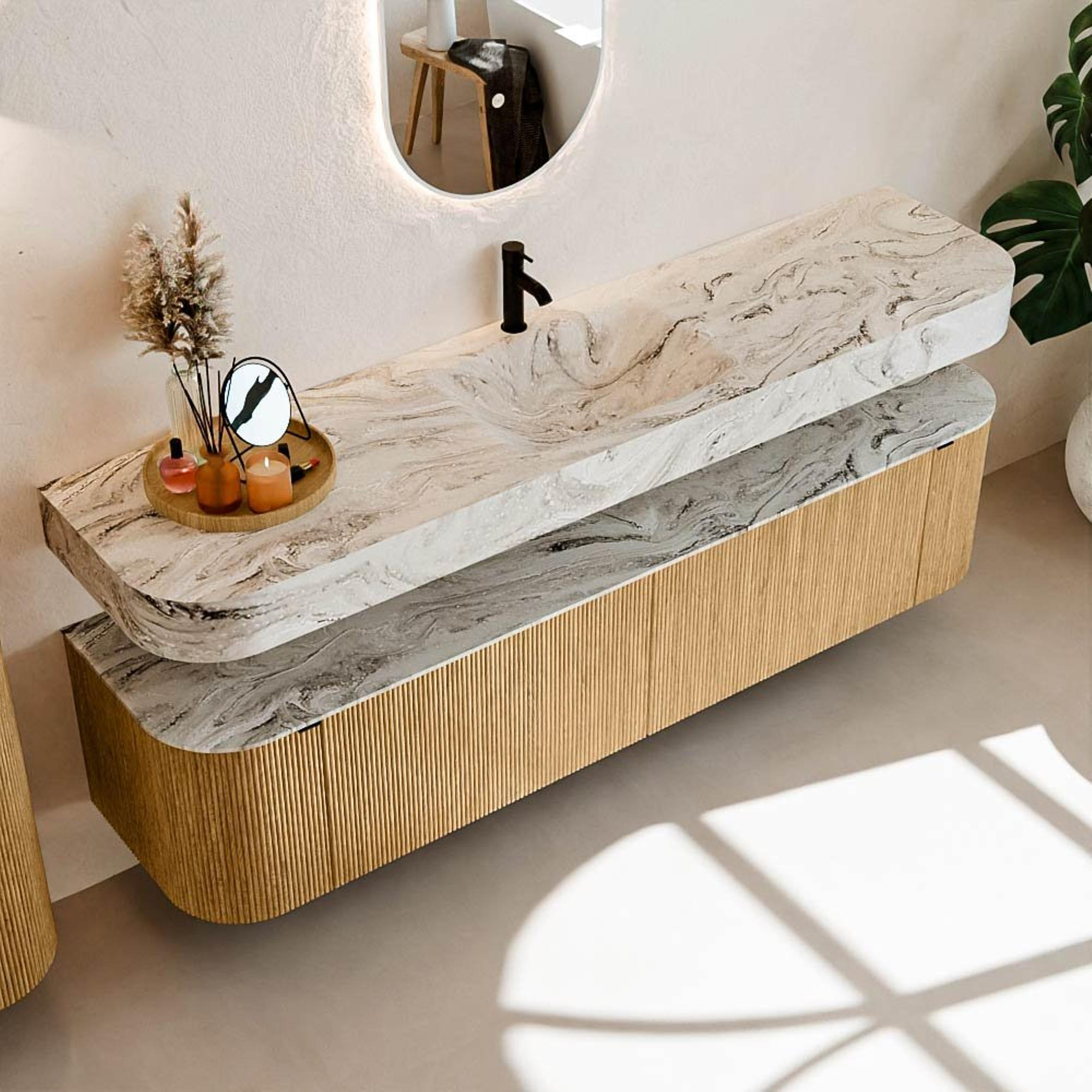 Matériaux naturels dans des tons chauds. Les cannelures verticales apportent rythme et texture au design, tandis que le chêne confère une apparence chaleureuse et artisanale. Choisissez parmi 5 teintes de bois OAK, WALNUT, DUSK, SHADOW et RUBY, des couleurs de bois soigneusement sélectionnées pour enrichir les salles de bains modernes et classiques.
