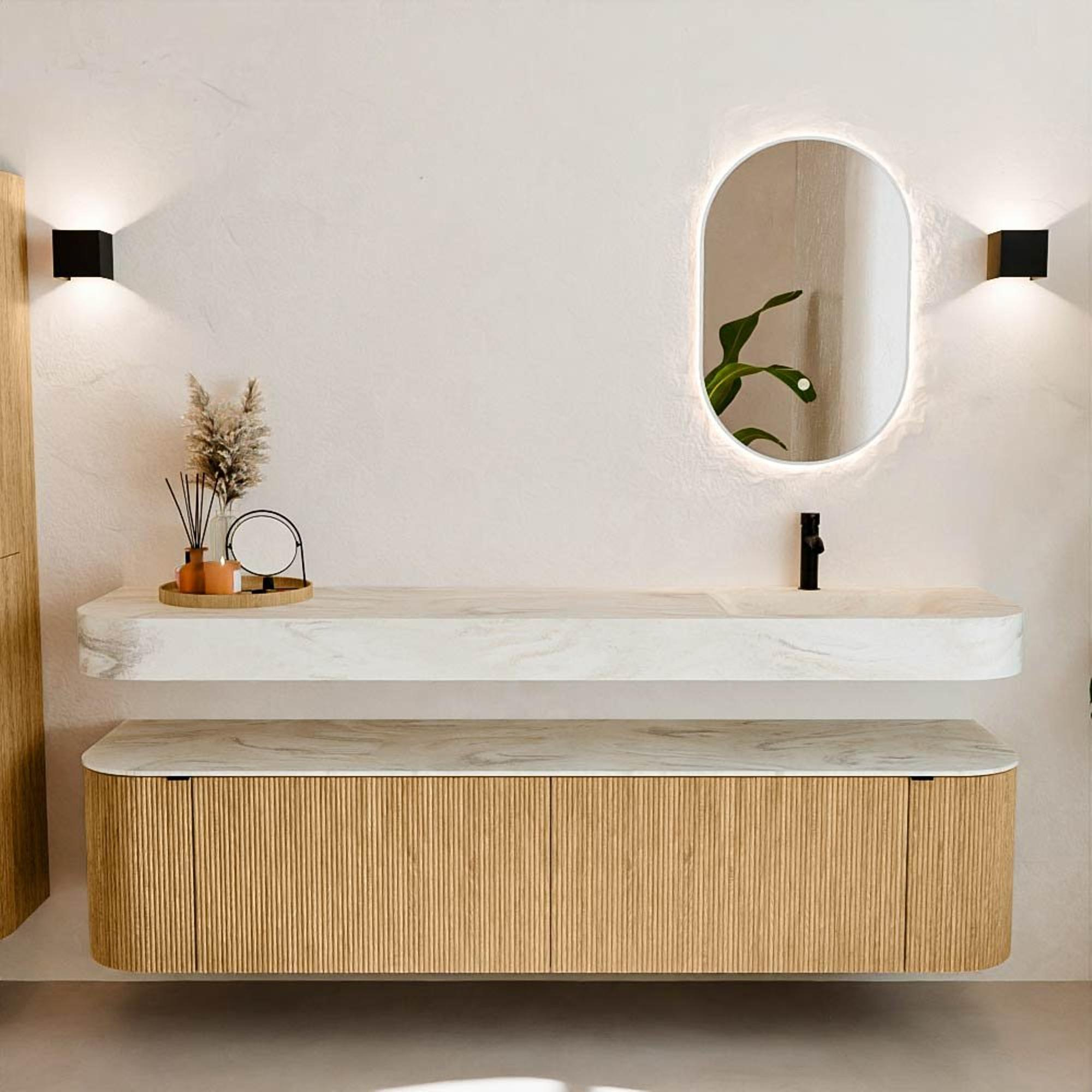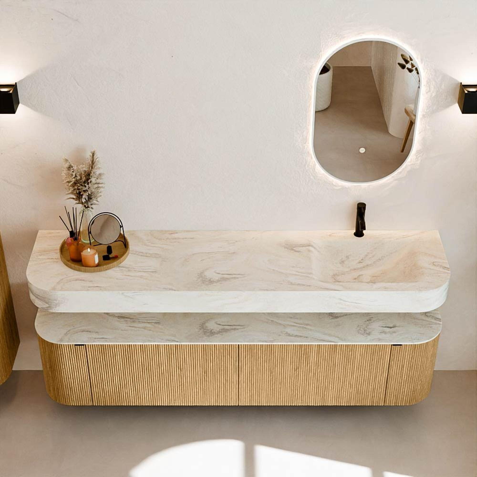 Au-dessus du meuble flotte une vasque suspendue assortie aux coins arrondis – parfaitement adaptée à la forme du meuble. La vasque est réalisée en Solid Surface et suit subtilement les lignes du meuble inférieur, créant ainsi un ensemble harmonieux. Le plan de travail en Solid Surface forme une base solide, facile d'entretien et complète la combinaison.