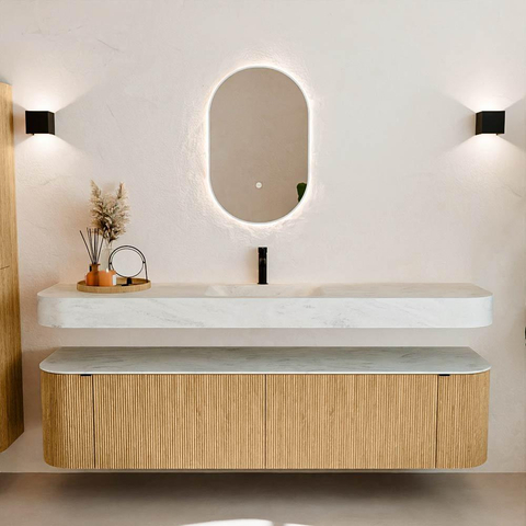 Au-dessus du meuble flotte une vasque suspendue assortie aux coins arrondis – parfaitement adaptée à la forme du meuble. La vasque est en Solid Surface et suit subtilement les lignes du meuble inférieur, créant ainsi un ensemble harmonieux. Le plan de travail en Solid Surface constitue une base solide et facile d'entretien, complétant la combinaison.