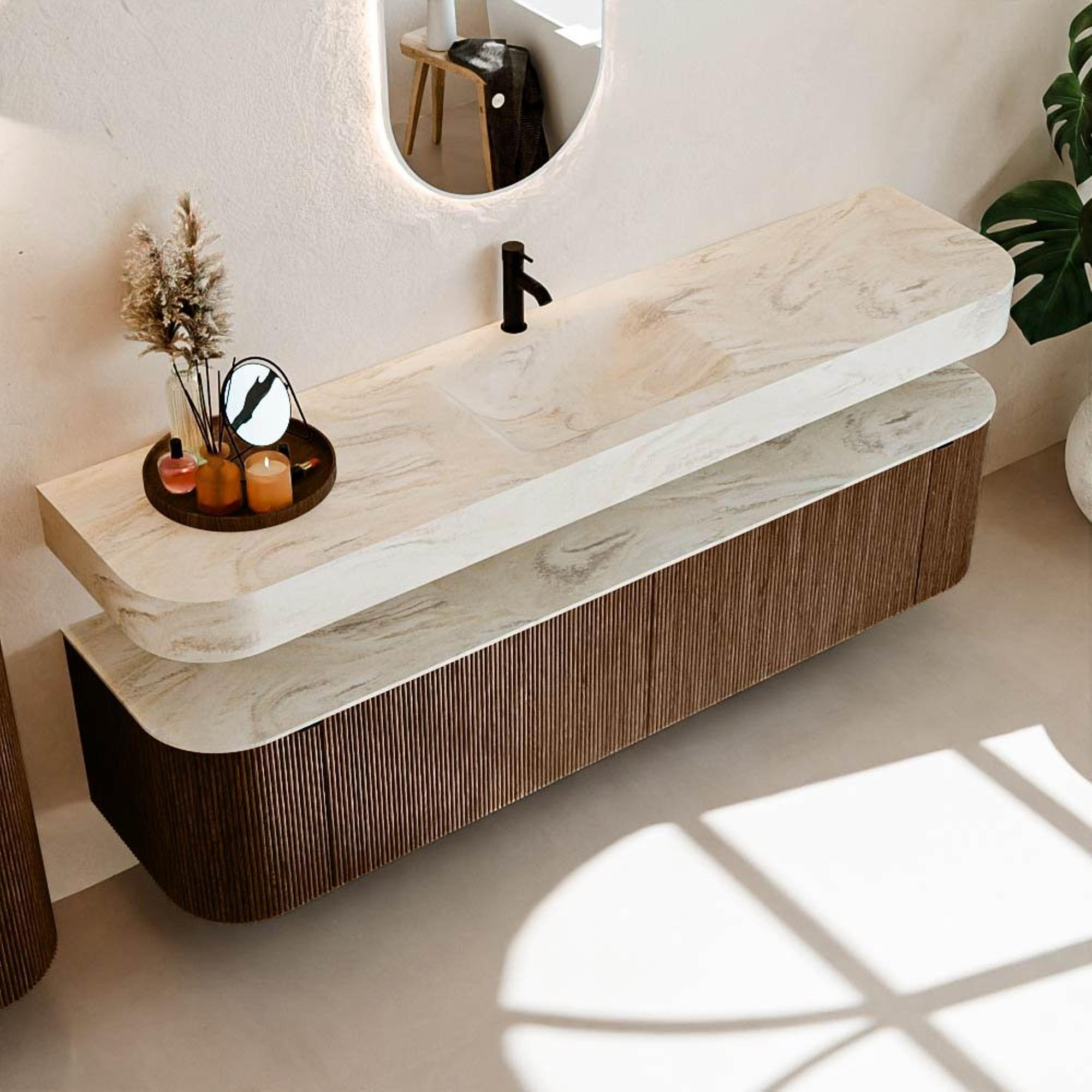 Matériaux naturels aux teintes chaudes. Les cannelures verticales apportent rythme et texture au design, tandis que le chêne confère une apparence chaleureuse et artisanale. Choisissez parmi 5 teintes de bois OAK, WALNUT, DUSK, SHADOW et RUBY, des couleurs de bois soigneusement sélectionnées pour enrichir les salles de bains modernes et classiques.