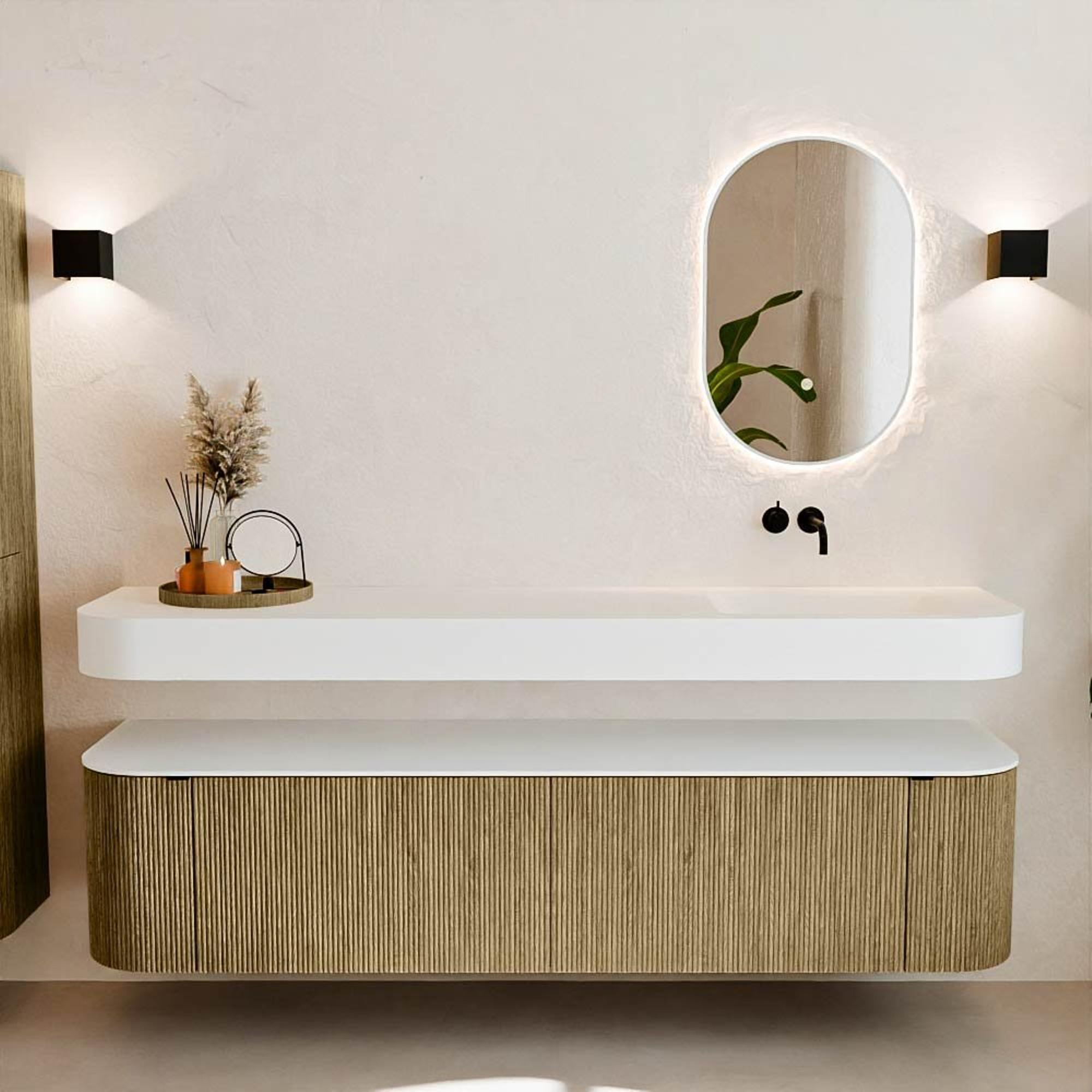 Au-dessus du meuble flotte une vasque suspendue assortie aux coins arrondis – parfaitement adaptée à la forme du meuble. La vasque est réalisée en Solid Surface et suit subtilement les lignes du meuble inférieur, créant un ensemble harmonieux. Le plan de travail en Solid Surface forme une base solide, facile d'entretien, et complète la combinaison.