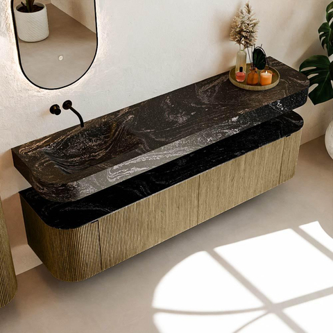 Matériaux naturels dans des tons chauds. Les cannelures verticales apportent rythme et texture au design, tandis que le chêne confère une apparence chaleureuse et artisanale. Choisissez parmi 5 teintes de bois OAK, WALNUT, DUSK, SHADOW et RUBY, des couleurs de bois soigneusement sélectionnées pour enrichir les salles de bains modernes et classiques.