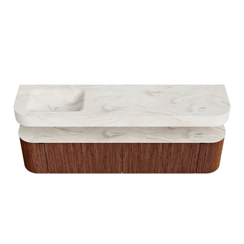 MONDIAZ THOR-DLUX 190cm meuble de salle de bains arrondi gauche + droite couleur Ruby avec 2 tiroirs et 2 portes. Vasque suspendue CLOUD Gauche sans trou de robinet couleur Ostra.