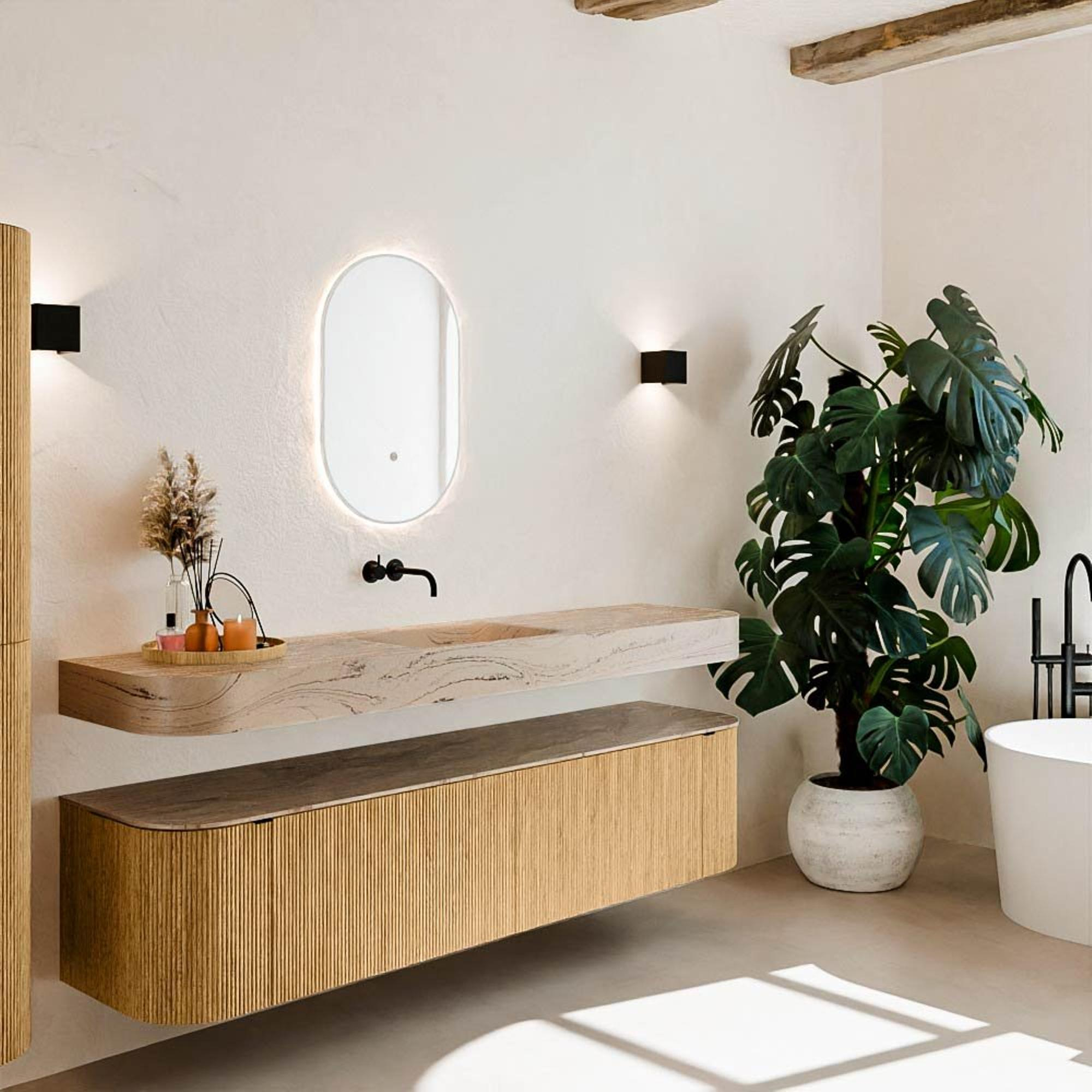 Matériaux naturels dans des tons chauds. Les cannelures verticales apportent rythme et texture au design, tandis que le chêne confère une apparence chaleureuse et artisanale. Choisissez parmi 5 teintes de bois OAK, WALNUT, DUSK, SHADOW et RUBY, des couleurs de bois soigneusement sélectionnées pour enrichir les salles de bains modernes et classiques.