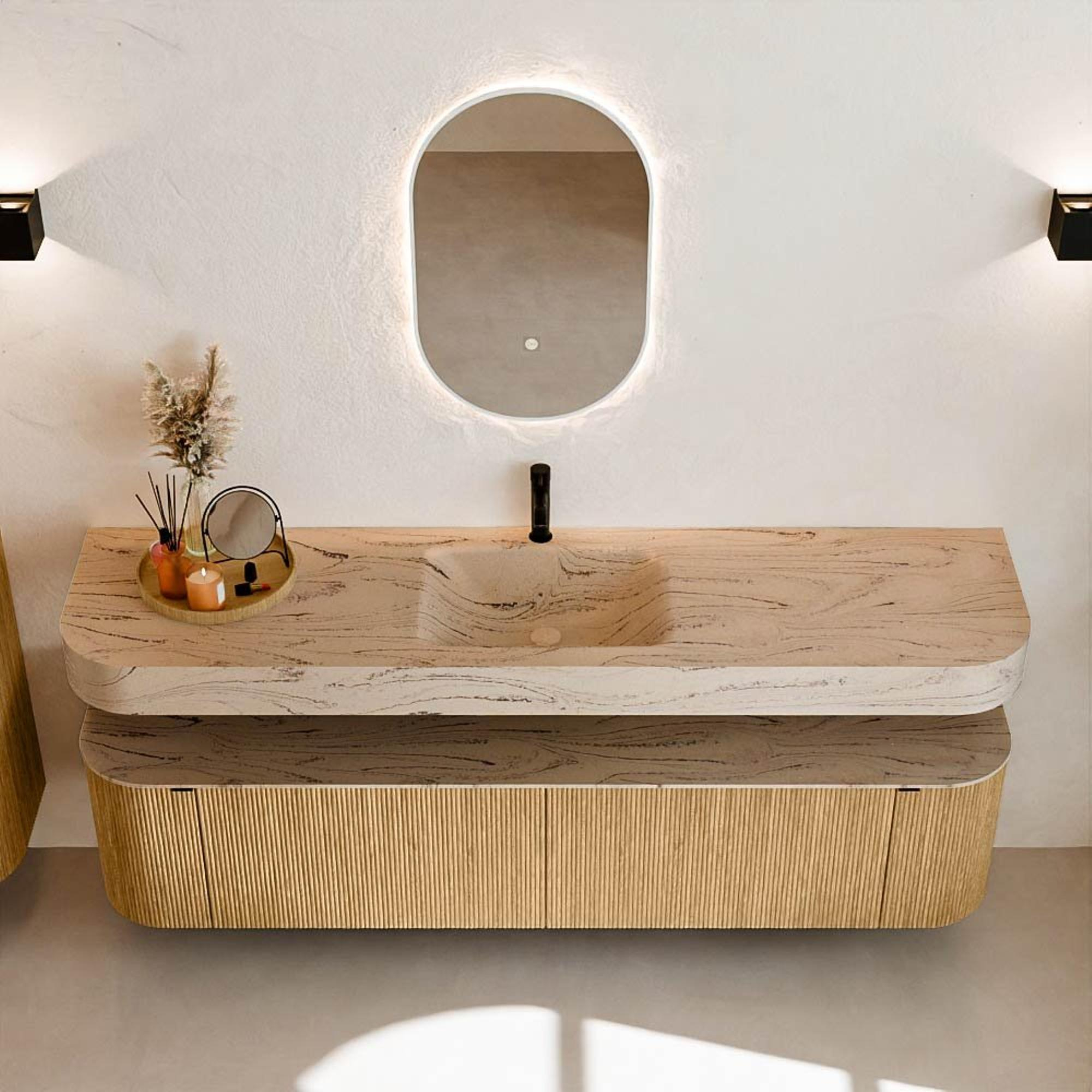 Au-dessus du meuble flotte une vasque suspendue assortie aux coins arrondis – parfaitement adaptée à la forme du meuble. La vasque est réalisée en Solid Surface et suit subtilement les lignes du meuble en dessous, créant un ensemble harmonieux. Le plan de travail en Solid Surface forme une base solide, facile d'entretien et complète la combinaison.