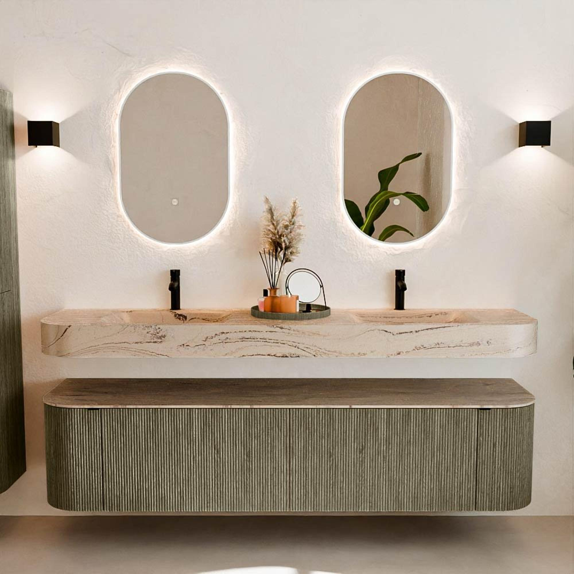 Matériaux naturels dans des tons chauds. Les nervures verticales apportent rythme et texture au design, tandis que le chêne confère une apparence chaleureuse et artisanale. Choisissez parmi 5 teintes de bois OAK, WALNUT, DUSK, SHADOW et RUBY, des couleurs de bois soigneusement sélectionnées pour enrichir les salles de bains modernes et classiques.
