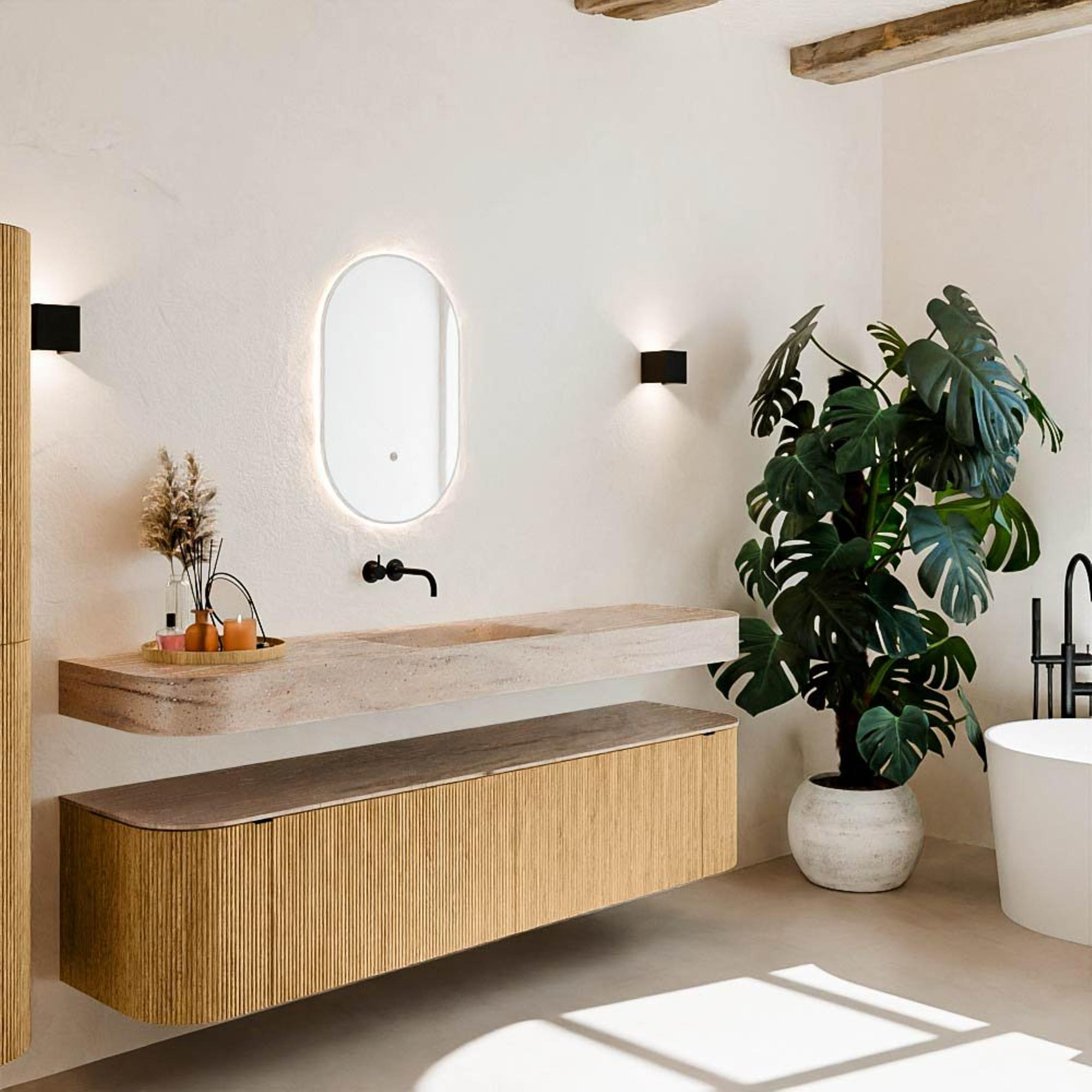 Matériaux naturels dans des tons chauds. Les nervures verticales apportent rythme et texture au design, tandis que le chêne confère une apparence chaleureuse et artisanale. Choisissez parmi 5 teintes de bois OAK, WALNUT, DUSK, SHADOW et RUBY, des couleurs de bois soigneusement sélectionnées pour enrichir les salles de bains modernes et classiques.