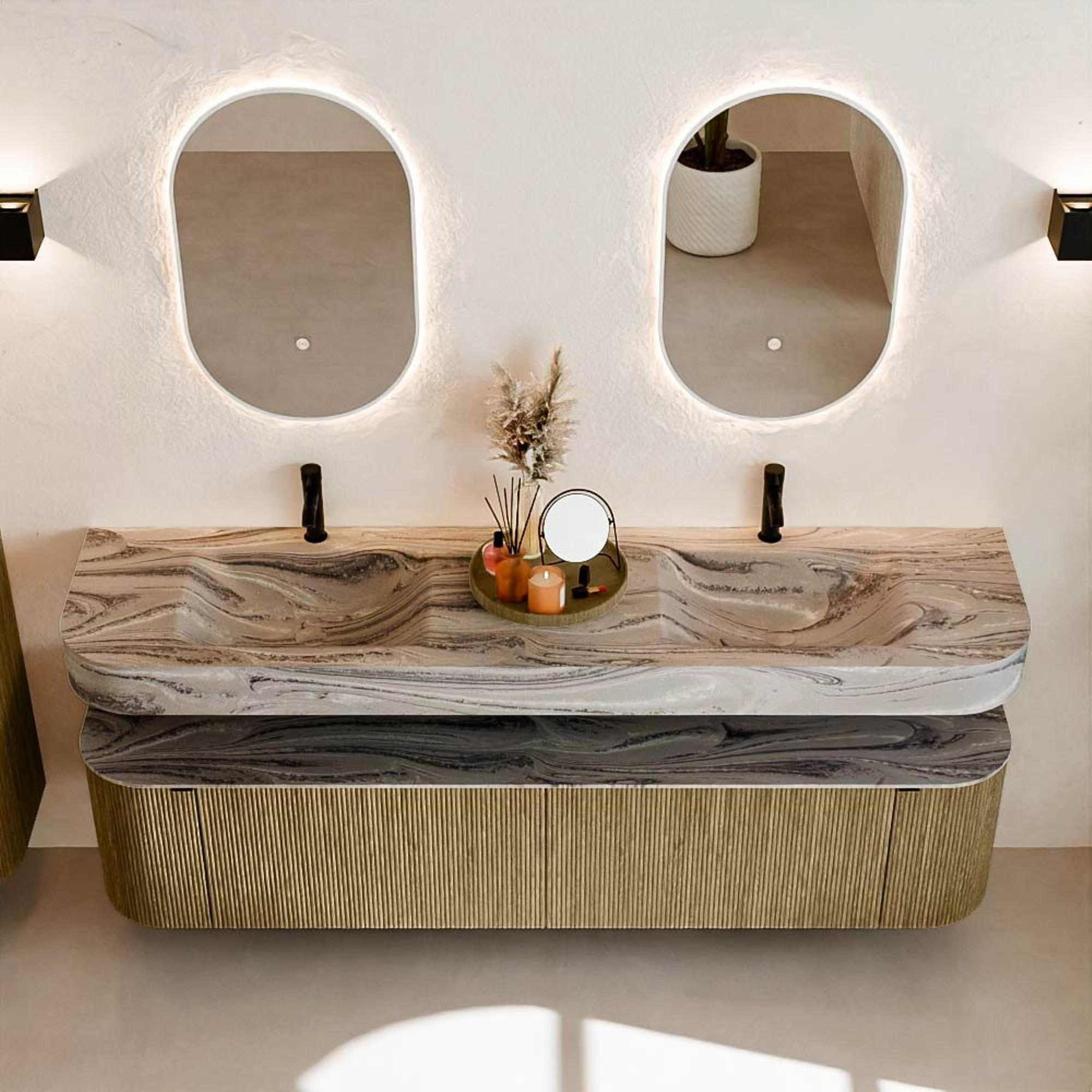 Matériaux naturels dans des tons chauds. Les nervures verticales apportent rythme et texture au design, tandis que le chêne confère une apparence chaleureuse et artisanale. Choisissez parmi 5 teintes de bois OAK, WALNUT, DUSK, SHADOW et RUBY, des couleurs de bois soigneusement sélectionnées pour enrichir les salles de bains modernes et classiques.