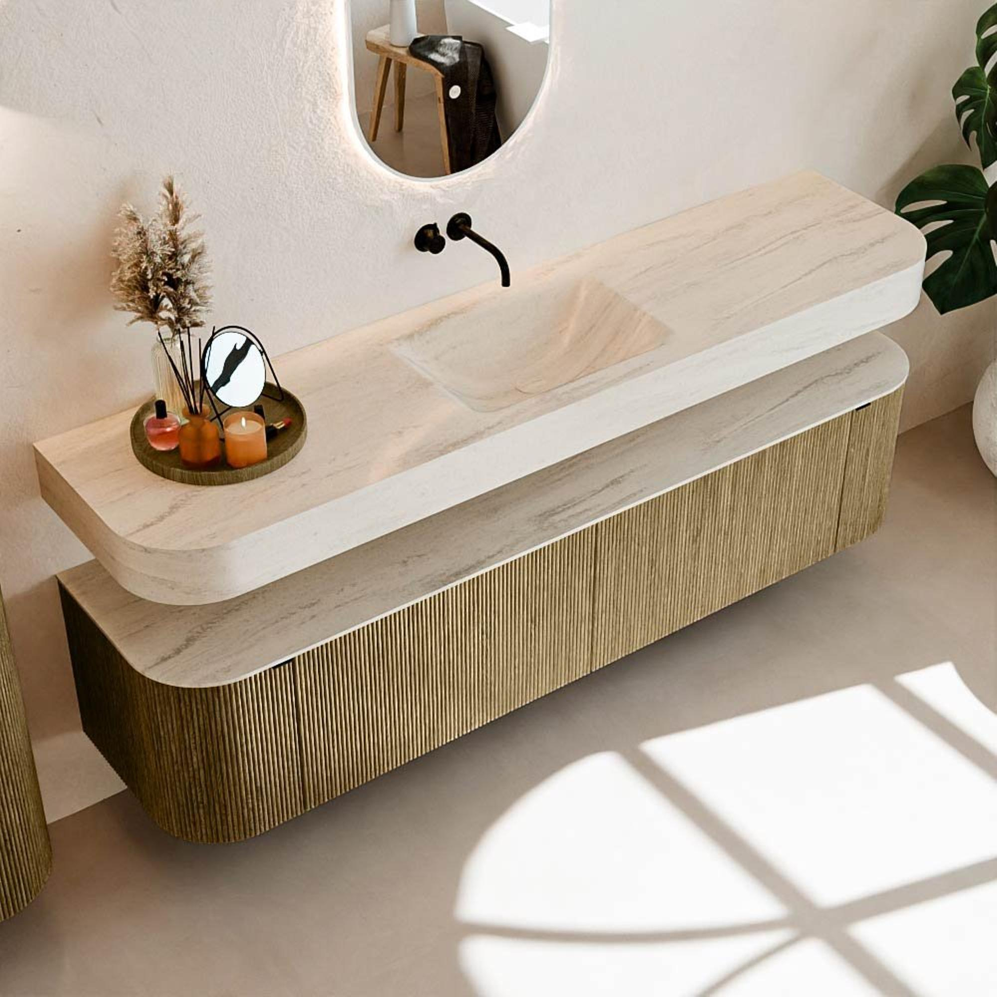 Au-dessus du meuble flotte une vasque suspendue assortie aux coins arrondis – parfaitement adaptée à la forme du meuble. La vasque est réalisée en Solid Surface et suit subtilement les lignes du meuble inférieur, créant ainsi un ensemble harmonieux. Le plan de travail en Solid Surface forme une base solide, facile d'entretien, et complète la combinaison.