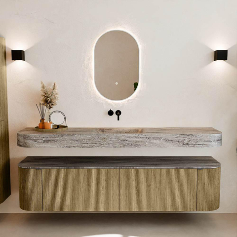 Matériaux naturels dans des tons chauds. Les rainures verticales apportent rythme et texture au design, tandis que le chêne confère une apparence chaleureuse et artisanale. Choisissez parmi 5 teintes de bois OAK, WALNUT, DUSK, SHADOW et RUBY, des couleurs de bois soigneusement sélectionnées pour enrichir les salles de bains modernes et classiques.
