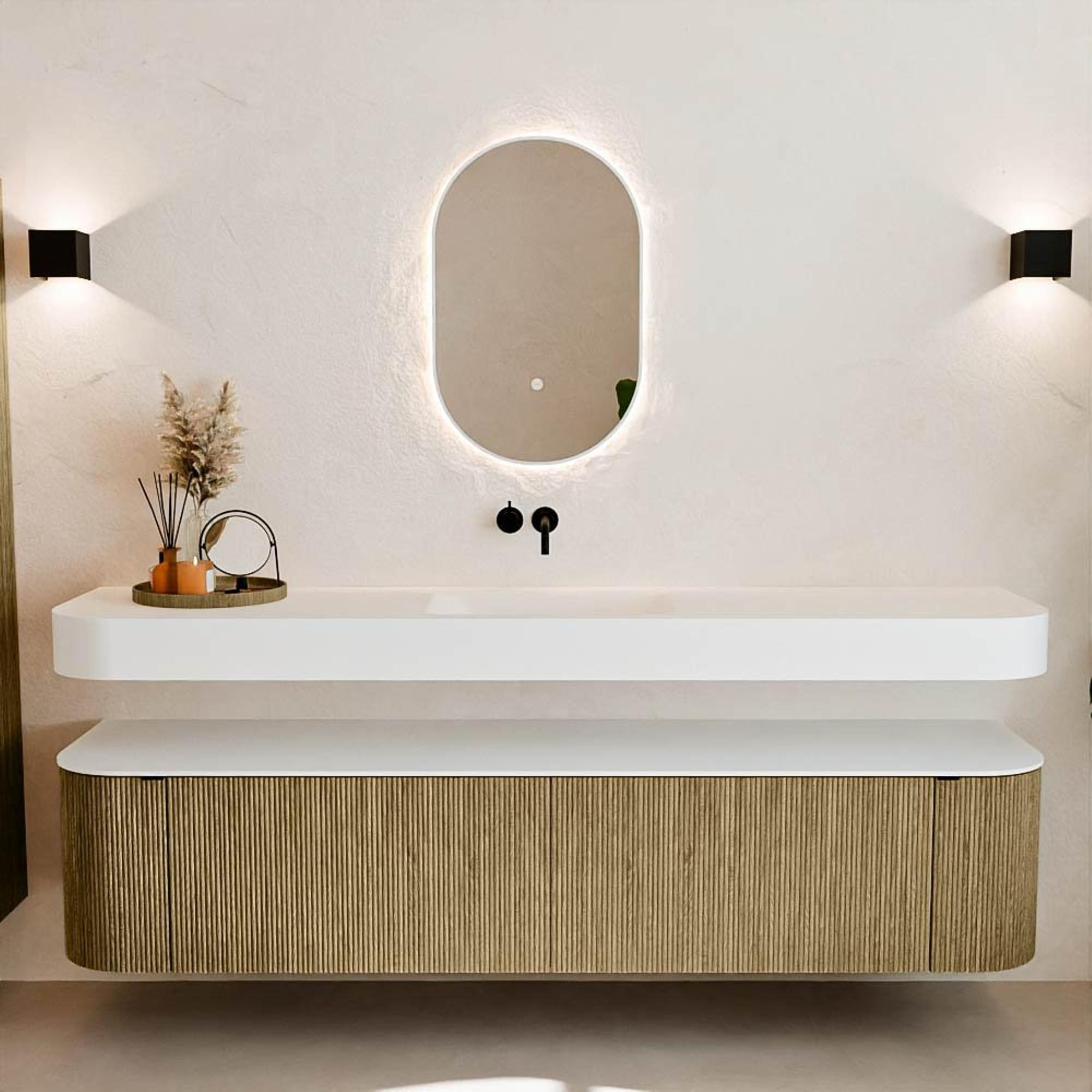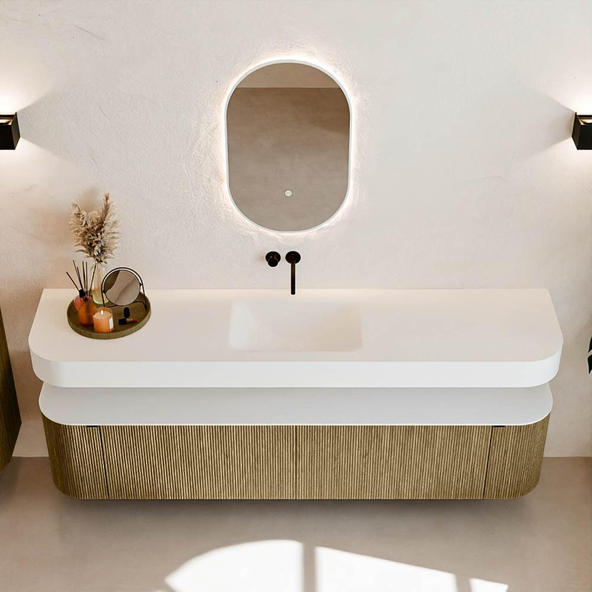 Au-dessus du meuble flotte une vasque suspendue assortie aux coins arrondis – parfaitement adaptée à la forme du meuble. La vasque est réalisée en Solid Surface et suit subtilement les lignes du meuble inférieur, créant ainsi un ensemble harmonieux. Le plan de travail en Solid Surface forme une base solide, facile d'entretien et complète la combinaison.