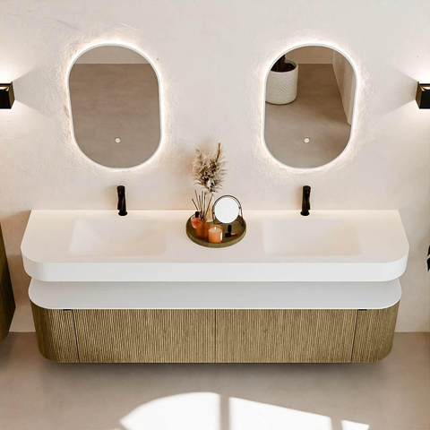 Matériaux naturels dans des tons chauds. Les nervures verticales apportent rythme et texture au design, tandis que le chêne confère une apparence chaleureuse et artisanale. Choisissez parmi 5 teintes de bois OAK, WALNUT, DUSK, SHADOW et RUBY, des couleurs de bois soigneusement sélectionnées pour enrichir les salles de bains modernes et classiques.