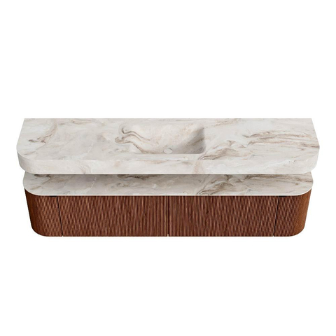 Un lavabo suspendu assorti flotte au-dessus du meuble avec des coins arrondis – parfaitement adapté à la forme du meuble. Réalisé en Solid Surface, le lavabo suit subtilement les lignes du meuble inférieur, créant un ensemble harmonieux. Le plan en Solid Surface forme une base robuste et facile à entretenir, complétant ainsi la combinaison.