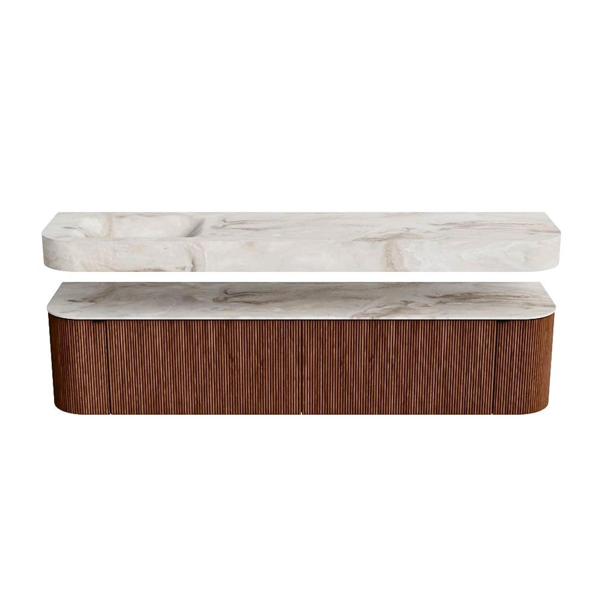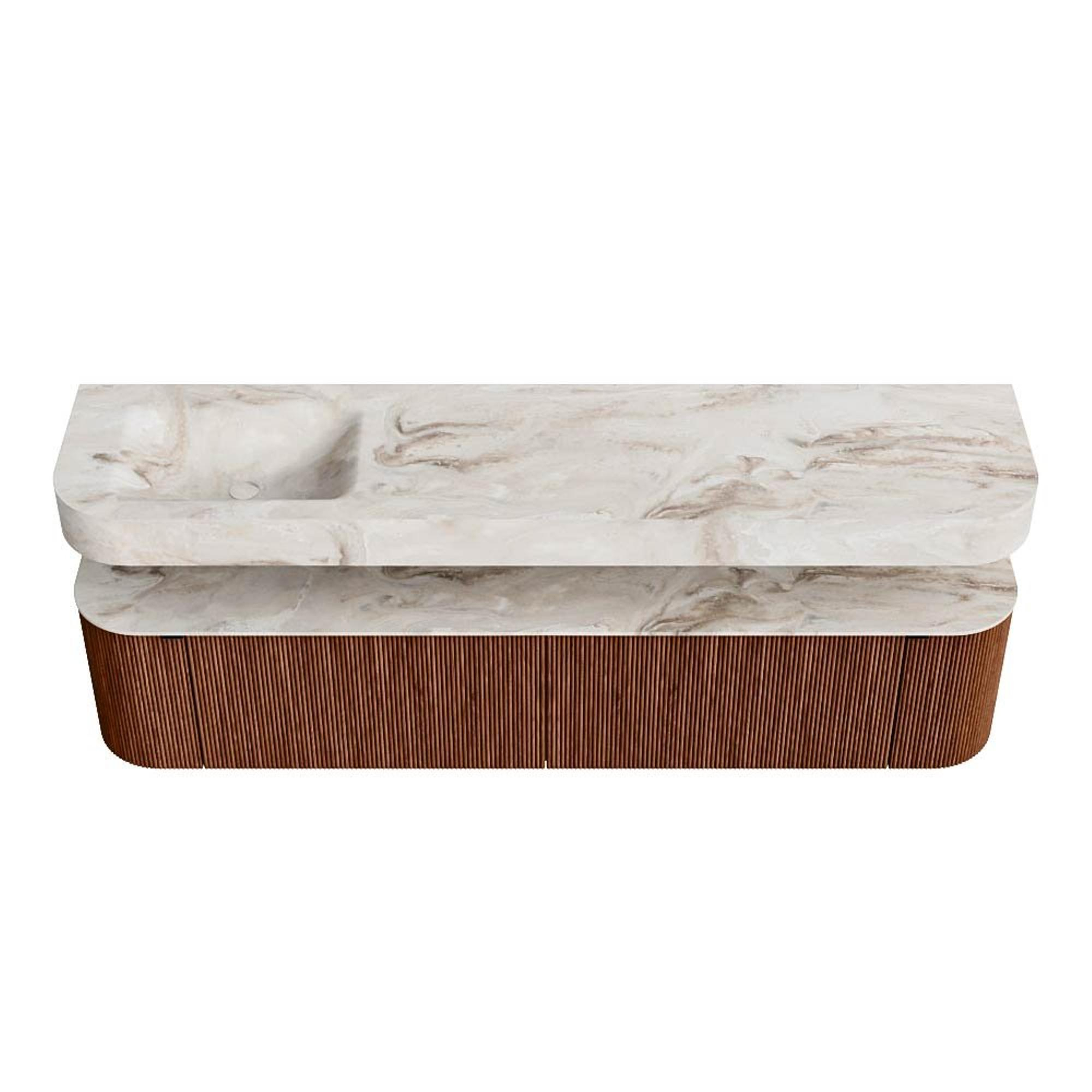 MONDIAZ THOR-DLUX Meuble de salle de bains - 200cm - arrondi gauche + droite - couleur Ruby - 2 tiroirs et 2 portes - Vasque suspendue CLOUD Gauche sans trou de robinet - couleur Frappe