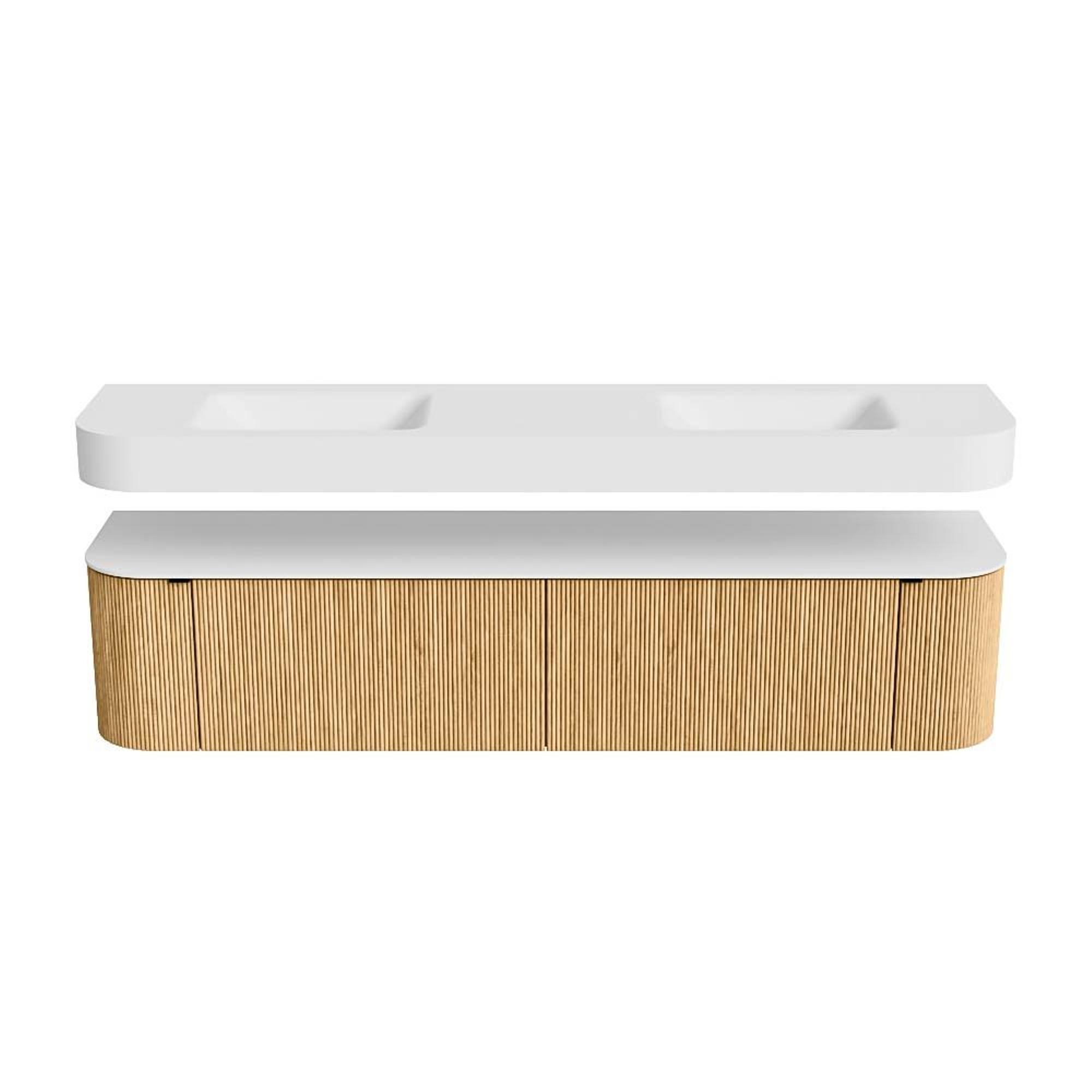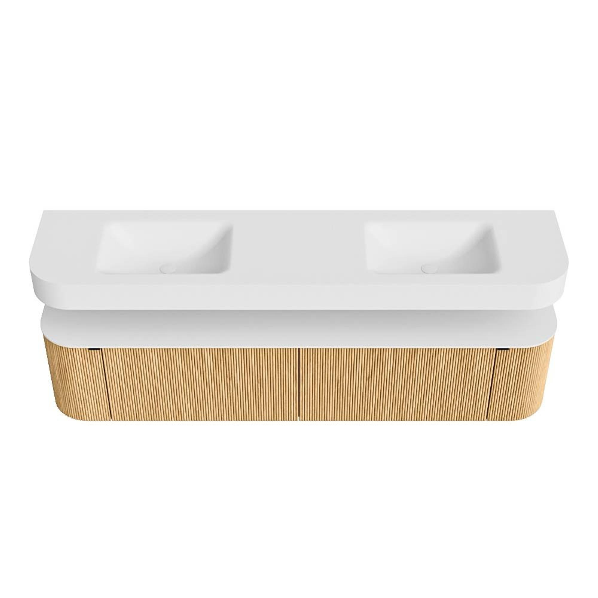 Boven het meubel zweeft een bijpassende, vrij hangende wastafel met afgeronde hoeken – perfect afgestemd op de vorm van de kast. De wastafel is uitgevoerd in Solid Surface en volgt subtiel de lijnen van het onderliggende meubel, waardoor een harmonieus geheel ontstaat. Het Solid Surface topblad vormt een sterke, onderhoudsvriendelijke basis en maakt de combinatie compleet.